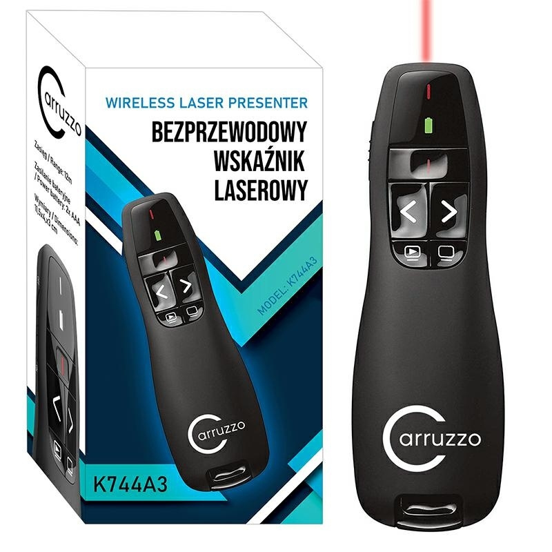 Pilot radiowy do sterowania prezentacjami multimedialnymi / pokazami slajdów z wbudowanym wskaźnikiem laserowym. Wystarczy podłączyć odbiornik USB (chowany w pilocie) do komputera, nie są wymagane dodatkowe sterowniki. Marka: CarruzzoSpecyfikacja techniczna: - zasięg: 12m - współpracuje z programami pakietu MS Office - wymagania systemowe: Windows 98/2000/XP/Vista/7, Linux, Mac OS - wbudowany wskaźnik laserowy - dł. fali lasera: 650nm - zasilanie bateryjne 2x AAA - funkcje: Następny slajd, Poprzedni slajd, Start/Pauza, Wygaszanie ekranu (w niektórych aplikacjach). - wymiary: 11,5x4x3cm