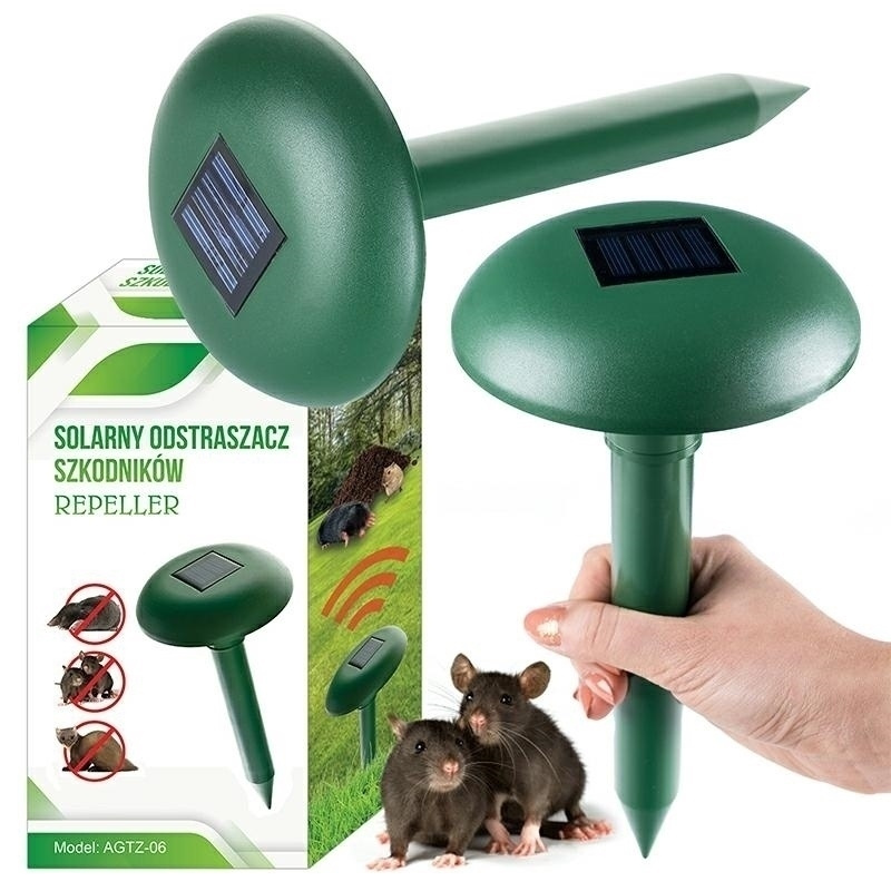 Solarny odstraszacz szkodników wykorzystuje zasadę drgań fal ultradźwiękowych: odstraszacz wysyła fale ultradźwiękowe o zakresie częstotliwości 400 - 1000 Hz, niesłyszalne dla ludzi i zwierząt domowych. Fale ultradźwiękowe o tym zakresie częstotliwości drażnią narządy słuchu i system nerwowy pospolitych szkodników ogrodowych, takich jak krety. Co 40 sekund urządzenie wysyła fale ultradźwiękowe wywołując drgania w wierzchniej warstwie gleby. Wytwarzane w ten sposób impulsy odstraszają szkodniki. Wyposażony w panel słoneczny do konwersji światła słonecznego na energię gromadzoną we wbudowanym akumulatorze. Lokalizacja urządzenia w miejscach najbardziej nasłonecznionych warunkuje jego optymalne działanie. W celu osiągnięcia jak najlepszych rezultatów, zaleca się instalować odstraszacze w 20-metrowych odstępach.Cechy produktu: - wbudowany akumulator 1.2V 600mAh ładowany solarnie - obszar skutecznego działania ok: 1000 m2. - materiał wykonania: wytrzymałe tworzywo sztuczne - emitowanie dźwięku + wibracji co 40 sekund - nieszkodliwy dla ludzi i zwierząt - wysokość ok:28 cm - średnica: trzonka - 3 cm - średnica części górnej - 12 cm Ilość szt. na palecie: 528
