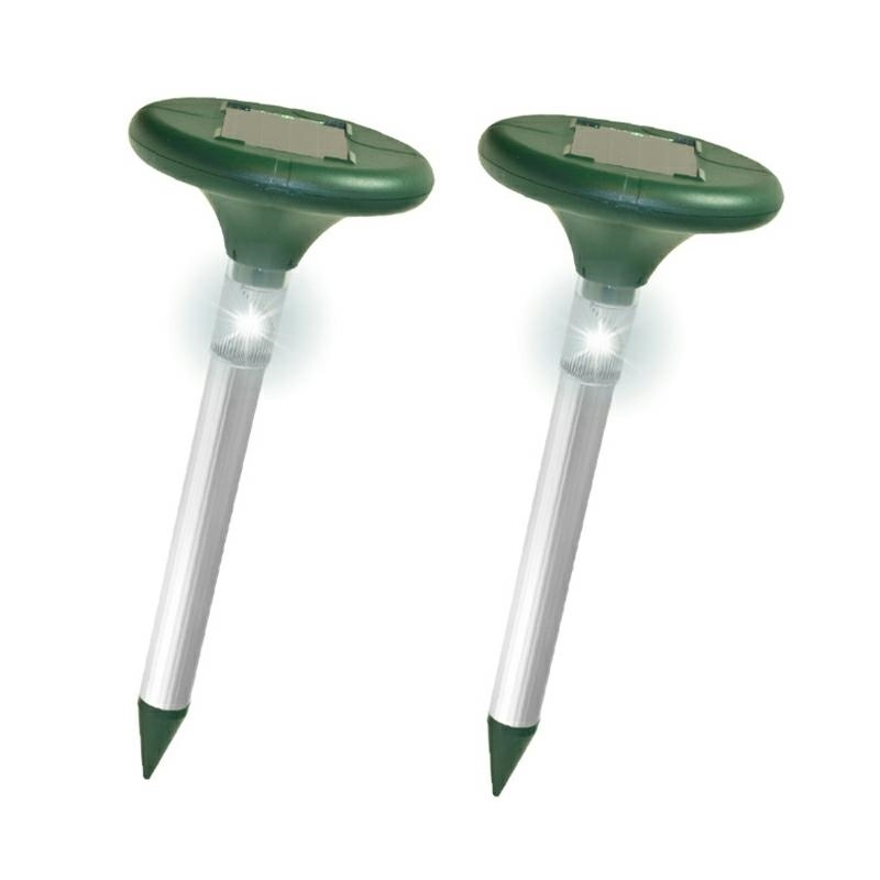 W skład zestawu wchodzą 2 odstraszacze. Solarny odstraszacz szkodników wykorzystuje zasadę drgań fal ultradźwiękowych: odstraszacz wysyła fale ultradźwiękowe o zakresie częstotliwości 400 - 1000 Hz, niesłyszalne dla ludzi i zwierząt domowych. Fale ultradźwiękowe o tym zakresie częstotliwości drażnią narządy słuchu i system nerwowy pospolitych szkodników ogrodowych, takich jak krety. Co 40 sekund urządzenie wysyła fale ultradźwiękowe wywołując drgania w wierzchniej warstwie gleby. Wytwarzane w ten sposób impulsy odstraszają szkodniki. Wyposażony w panel słoneczny do konwersji światła słonecznego na energię gromadzoną we wbudowanym akumulatorze. Lokalizacja urządzenia w miejscach najbardziej nasłonecznionych warunkuje jego optymalne działanie. W celu osiągnięcia jak najlepszych rezultatów, zaleca się instalować odstraszacze w 20-metrowych odstępach.Cechy produktu:- 2 odstraszacze w zestawie - wbudowany akumulator 1.2V 600mAh ładowany solarnie - panel solarny: 9 x 6 cm - obszar skutecznego działania ok: 1000 m2. - wysokość ok. 37 cm - średnica: trzonek - 3 cm, część górna - 15 cm - materiał wykonania: tworzywo sztuczne + metalowy trzpień - oświetlenie LED + czujnik zmierzchu - emitowanie dźwięku + wibracji co 40 sekund - nieszkodliwy dla ludzi i zwierząt Produkt zapakowany w dodatkowy foliopak - gotowy do wysyłki. Ilość szt. na palecie: 300