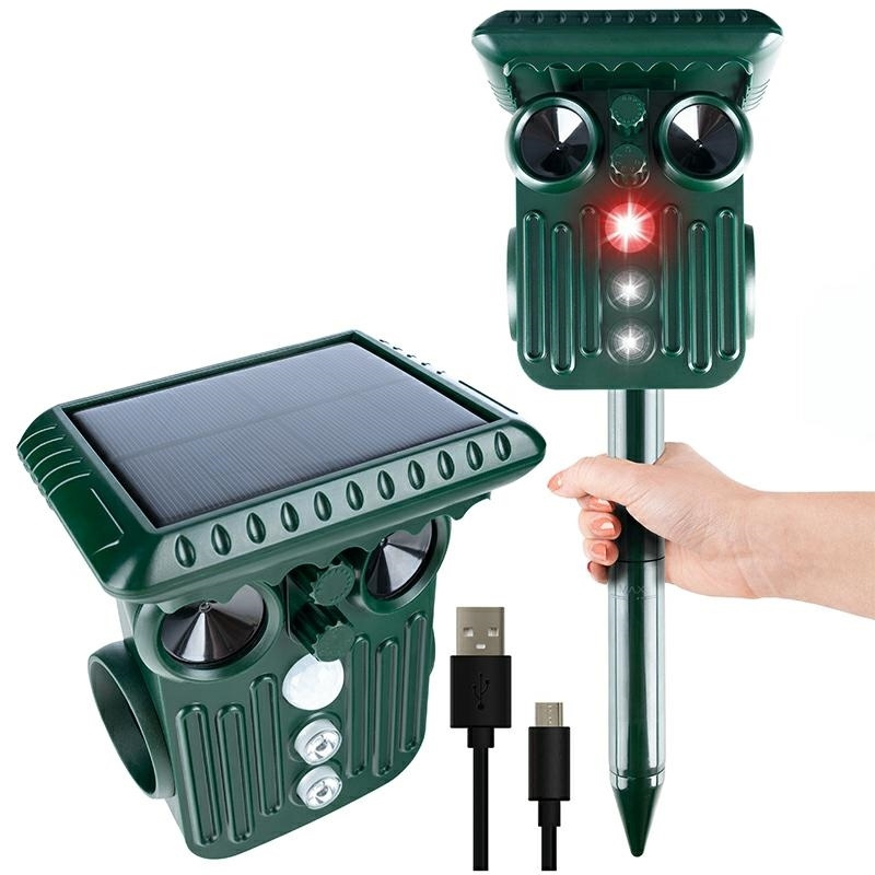 Wydajny odstraszacz zwierząt działający na zasadzie emitowania różnej częstotliwości ultradźwięków oraz mocnego światła LED. Emitowane dźwięki i błyski świetlne są bardzo uciążliwe dla zwierząt, dzięki czemu skutecznie je odstraszają nie robiąc krzywdy. Urządzenie włączy się, gdy zwierzę wejdzie w zakres pracy czujnika ruchu, co pozwala zaoszczędzić energię. Specyfikacja: zasilanie słoneczne - wbudowany akumulator 3.7V 2000mAh możliwość ładowania przez port microUSB (kabel w zestawie) kąt czujnika: 110st. zasięg czujnika ruchu: 7-9m (w zależności od wielkości zwierzęcia) wymiary panelu solarnego: 108x82mm wymiary odstraszacza: 17x13,5x10cm wysokość z kołkiem montażowym: 42cm wymiary opakowania: 15,5x13x14,5cm 5 trybów pracy: -1: 13.5kHz-19,55kHz do odstraszania zwierząt, takich jak myszy, szczury, psy, lisy, itp. -2: 13,5 kHz-28,8 kHz do odstraszania zwierząt, takich jak koty, szopy, borsuki, skunksy itp -3: 400Hz-1000Hz do odstraszania zwierząt, takich jak nietoperze, ptaki, gryzonie itp -4: Silne migające światła LED odstraszające zwierzęta, takie jak szop pracz, dzik, kuna itp -5: Wszystkie kombinacje z silnym miganiem LED. Odstraszacz będzie działał w kolejności od 1 do 4, zmieniając częstotliwość co 5 sekund. Produkt zapakowany w dodatkowy foliopak - gotowy do wysyłki. Ilość szt. na palecie: 480