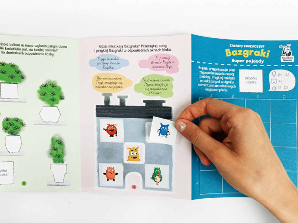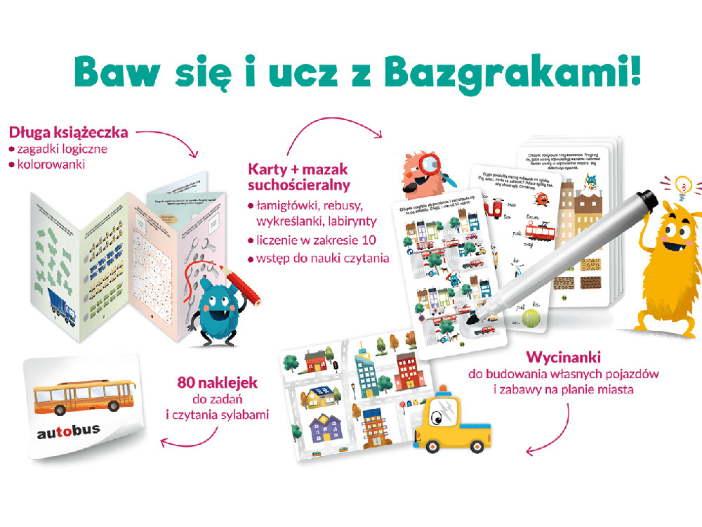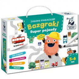 Bazgraki Super pojazdy to zbiór twórczych, edukacyjnych zabaw, dzięki którym starsze przedszkolaki mogą rozwijać umiejętność liczenia, pisania, czytania, myślenia logicznego oraz poznawać miejską przestrzeń.