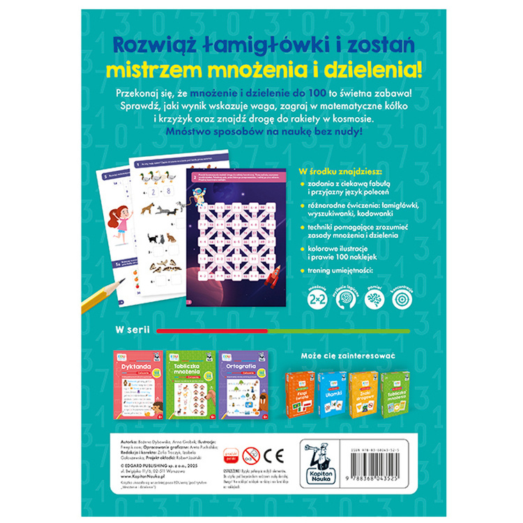 Kapitan Nauka EDUseria. Mnożenie i dzielenie. Ćwiczenia to praktyczna i atrakcyjna książeczka edukacyjna, która pomaga dzieciom opanować podstawy mnożenia i dzielenia w przejrzysty, uporządkowany i przyjazny sposób. Dzięki różnorodnym zadaniom matematyka staje się ciekawa, angażująca i pełna satysfakcji.