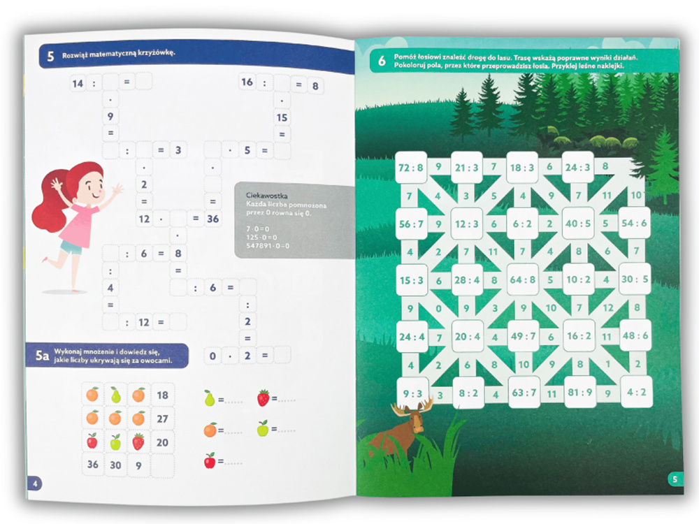 W środku znajdują się starannie opracowane ćwiczenia utrwalające działania na liczbach, zarówno proste przykłady, jak i zadania tekstowe rozwijające logiczne myślenie. Stopniowanie trudności pozwala dopasować materiał do umiejętności dziecka i wspiera pewne poruszanie się w świecie podstawowych działań arytmetycznych.