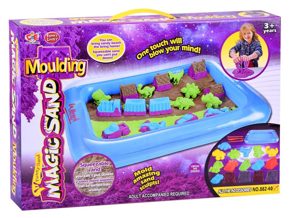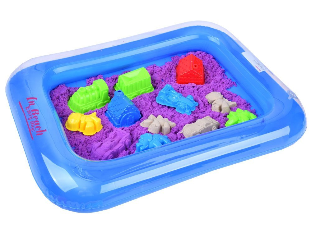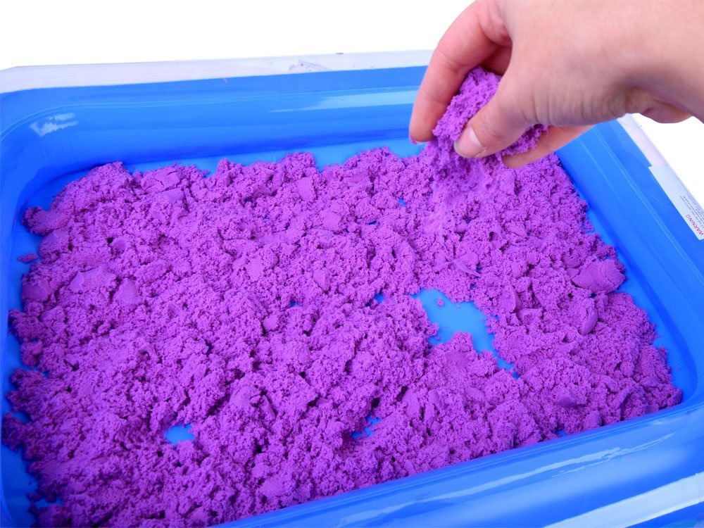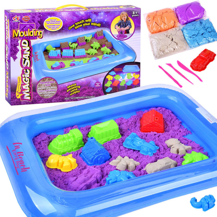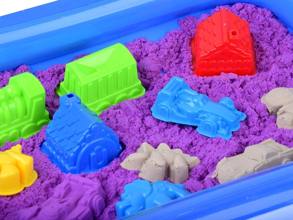 Kinetischer Sand mit Formen und einem Plastiksandkasten ist eine Spielmöglichkeit für die Kleinen. Ein magisches Spiel im Sand wird Ihnen viel Spaß und Freude bereiten.