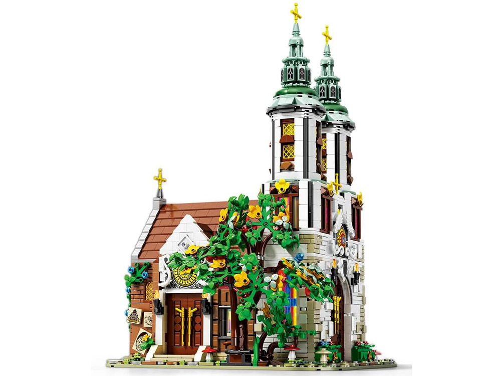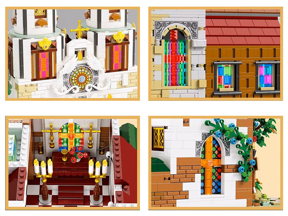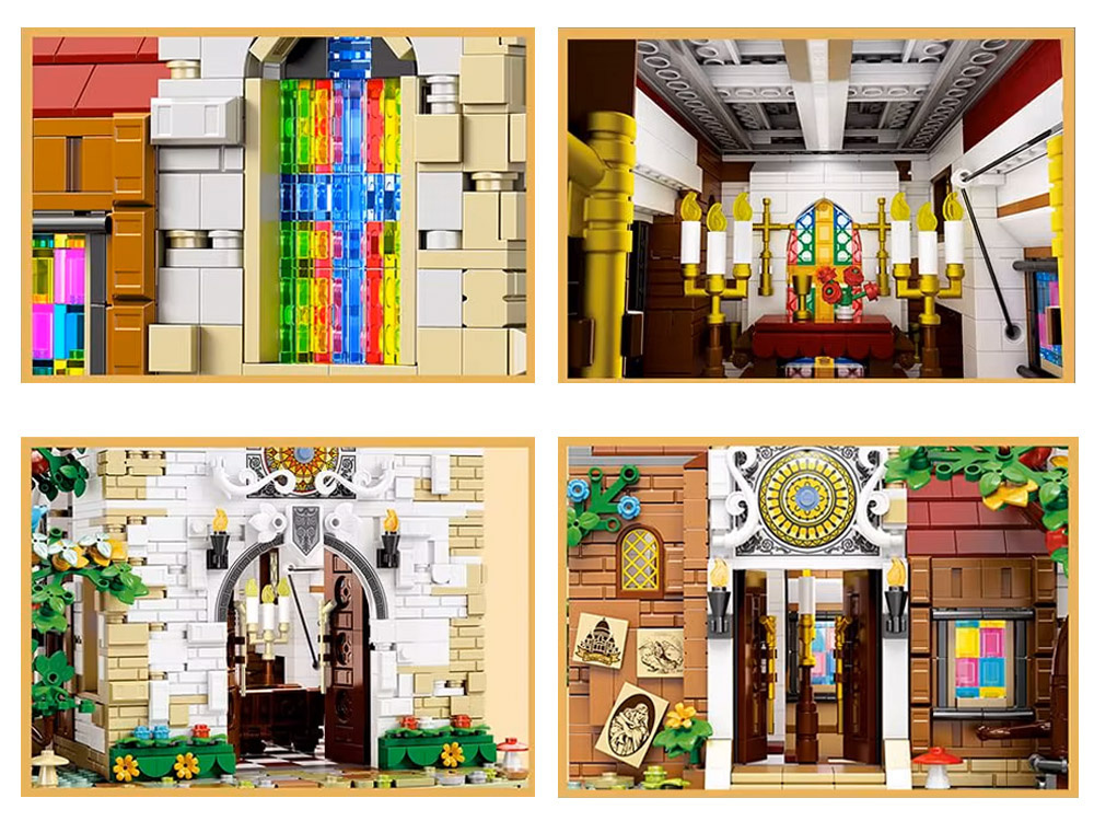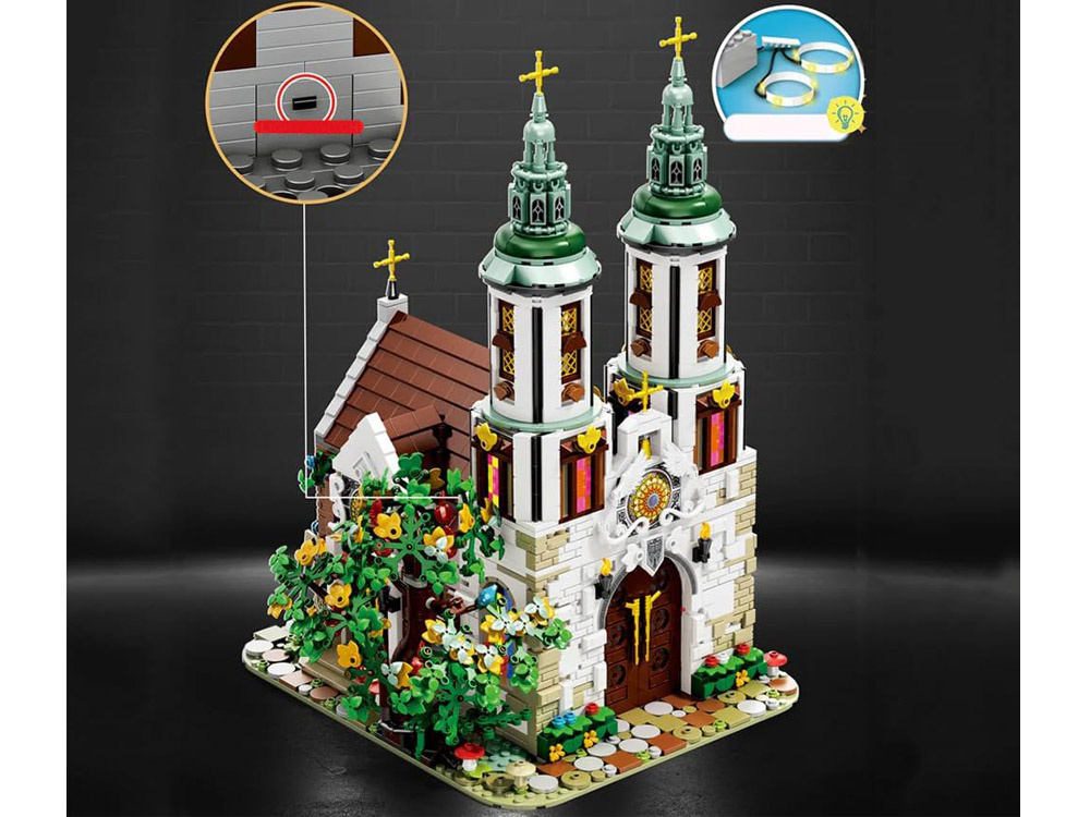 Zestaw został wyposażony w efektowne oświetlenie, które podkreśla piękno kolorowych witraży i detali architektonicznych. Dzięki temu model prezentuje się wyjątkowo efektownie również po zmroku.