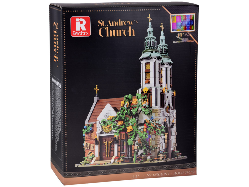 Zestaw klocków Kościół Świętego Andrzeja to imponująca konstrukcja składająca się z 3087 elementów, w tym 49 kolorowych, przezroczystych cegieł imitujących efektowne witraże. Model został zaprojektowany z myślą o pasjonatach budowli historycznych, architektury sakralnej oraz miłośnikach zaawansowanych zestawów konstrukcyjnych.