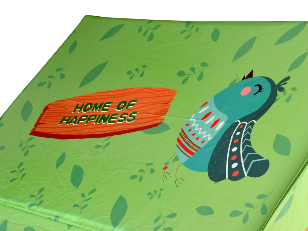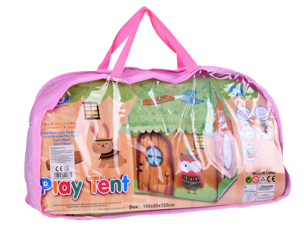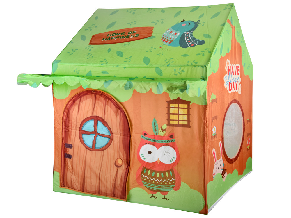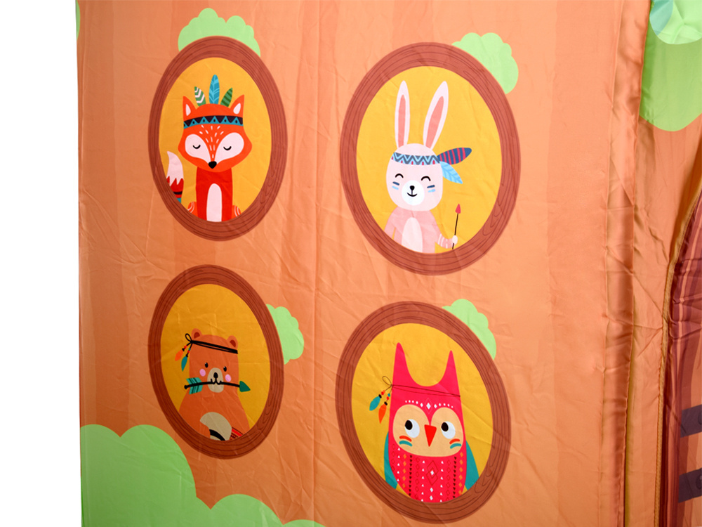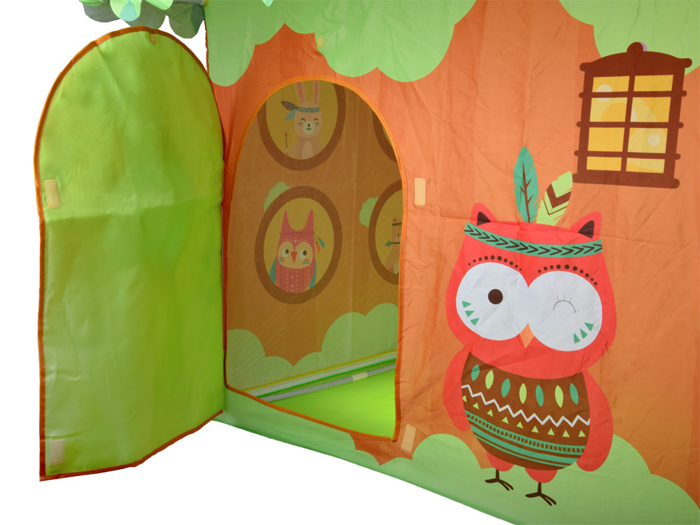 Namiot posiada praktyczne drzwi i okna, które umożliwiają łatwy dostęp i dodatkowo zachęcają do zabawy w domek. Całość została ozdobiona uroczymi postaciami leśnych zwierzątek, takimi jak sowa czy ptaszek, tworząc bajkowy, przyjazny klimat.