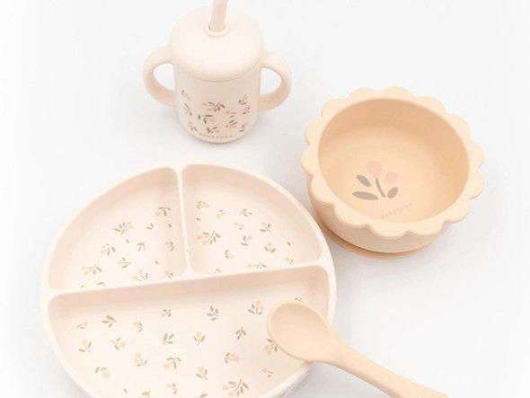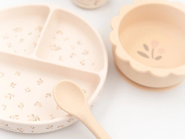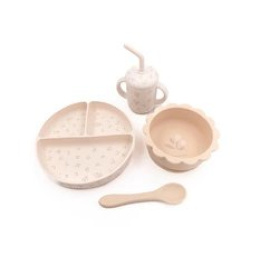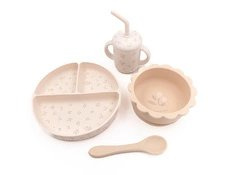 Naczynia dla dzieci z bezpiecznego silikonu Bamboom idealnie sprawdzą się podczas obiadku, deseru czy jako naczynia na przekąski. Naczynia Bamboom dla dzieci są bezpieczna dla środowiska i nie zawierają BPA. Można je podgrzewać w kuchence mikrofalowej i myć w zmywarce. Materiał, z którego wykonane zostały naczynia to 100% silikon. Komplet składa się z: talerzyka z przyssawką, miseczki z przyssawką, bidonu z rurką i łyżeczki.
