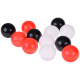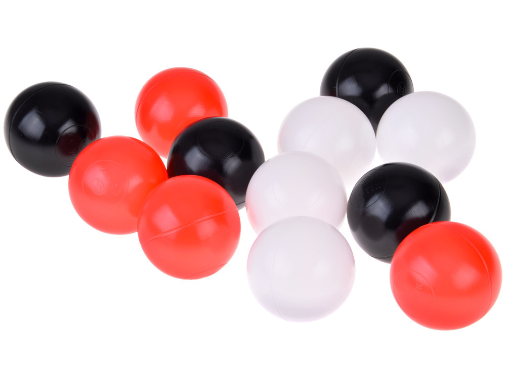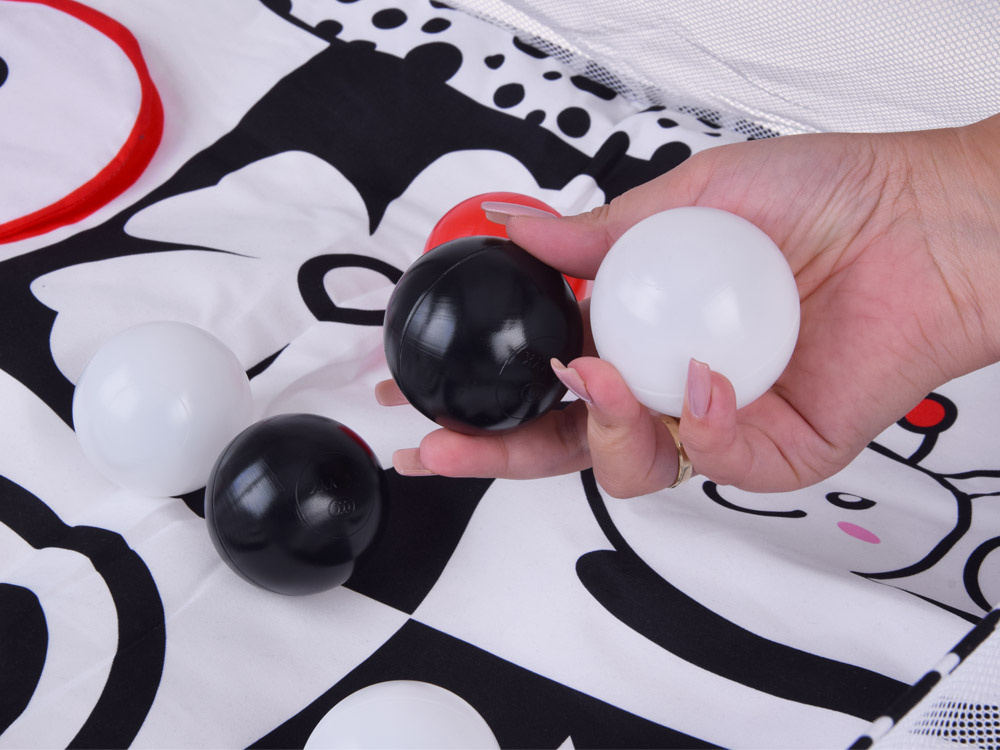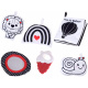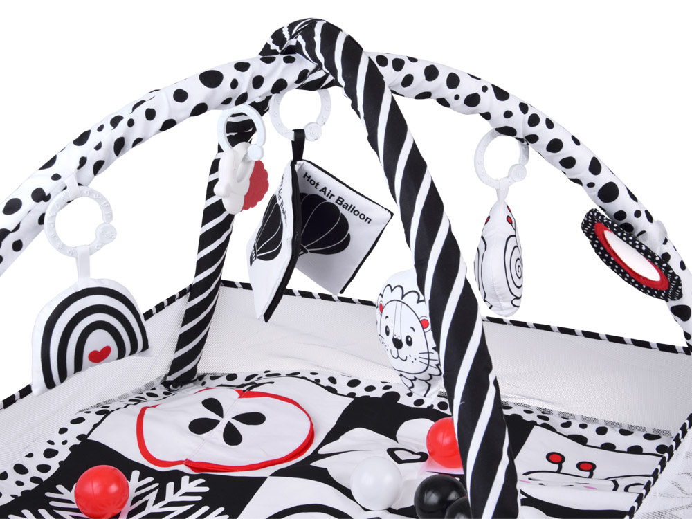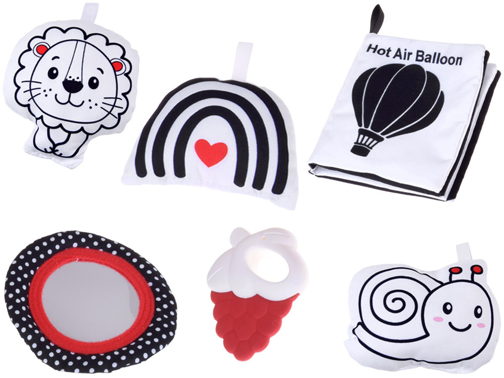 - kontrastowe elementy (czarny, biały, czerwony) pomagają trenować ostrość widzenia oraz koordynację wzrokową