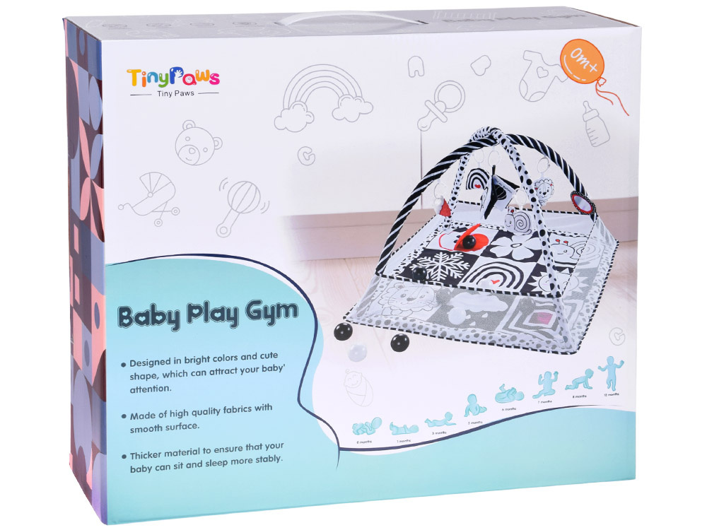 - kontrastowe obrazki na macie zachęcają do leżenia na brzuszku, podnoszenia główki i ramion, co wspiera rozwój mięśni szyi, pleców i barków- to ważne przygotowanie do dalszych etapów – obracania się, raczkowania i chodzenia.