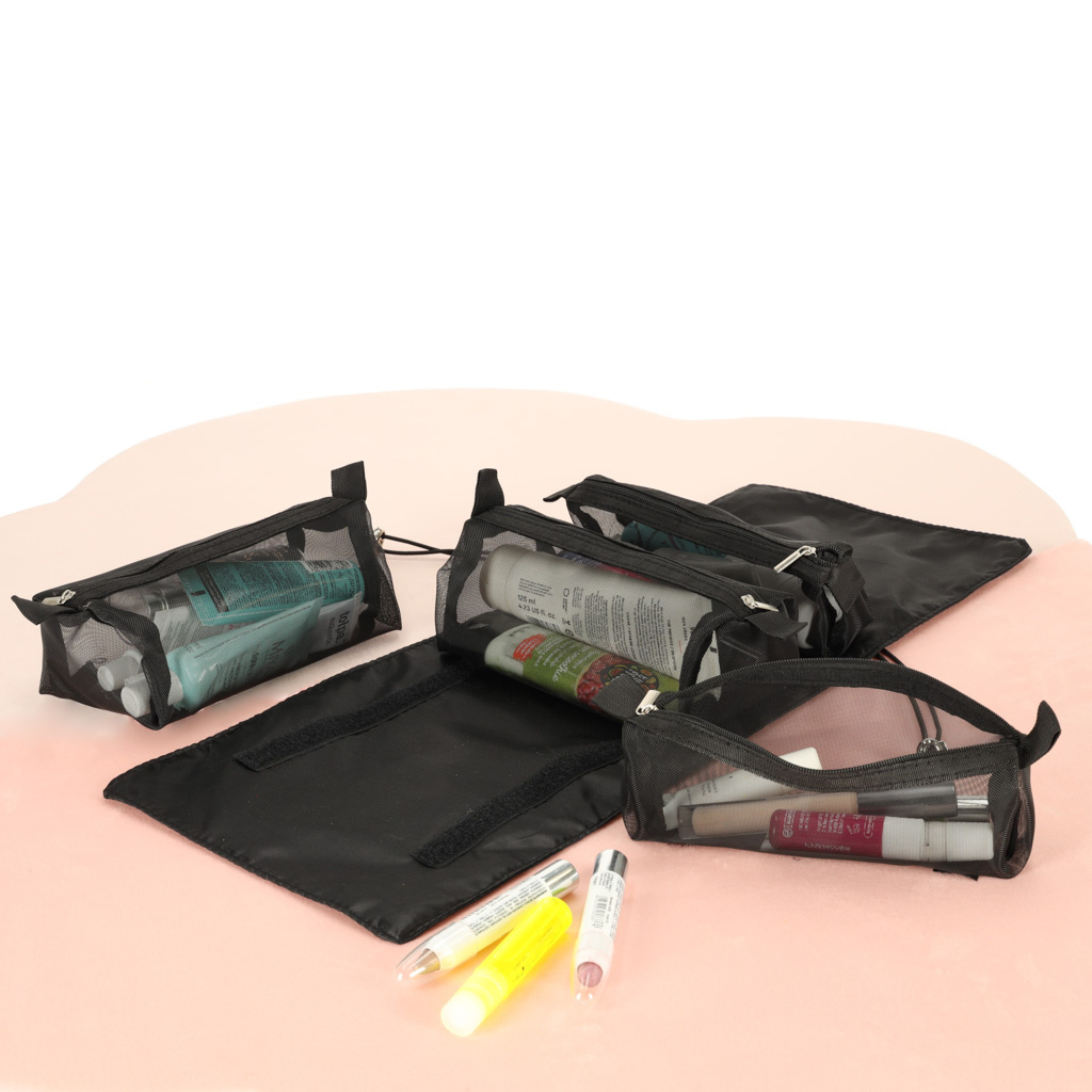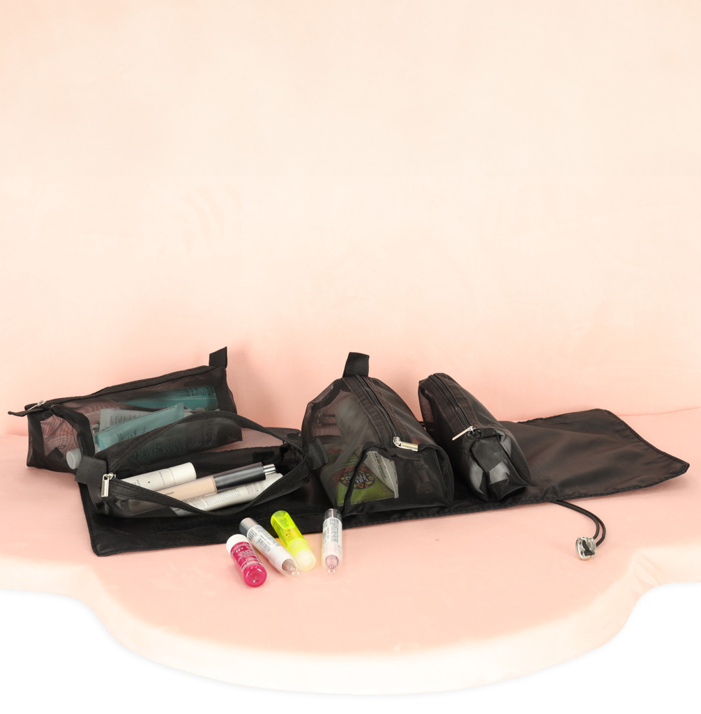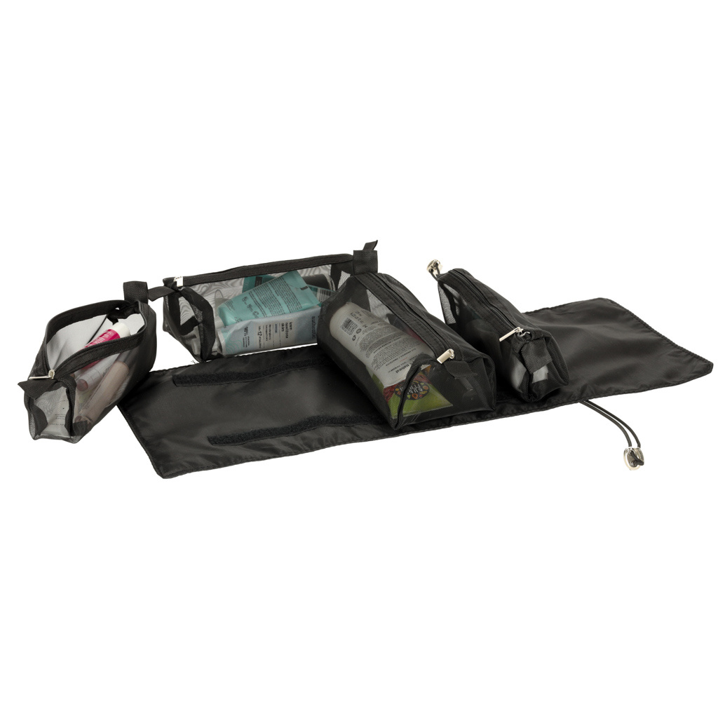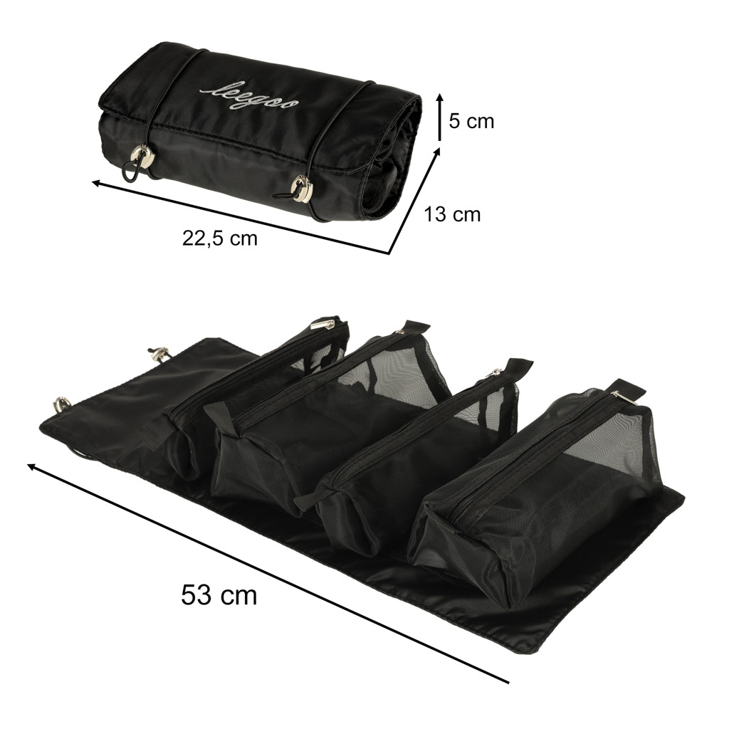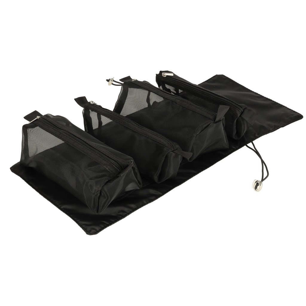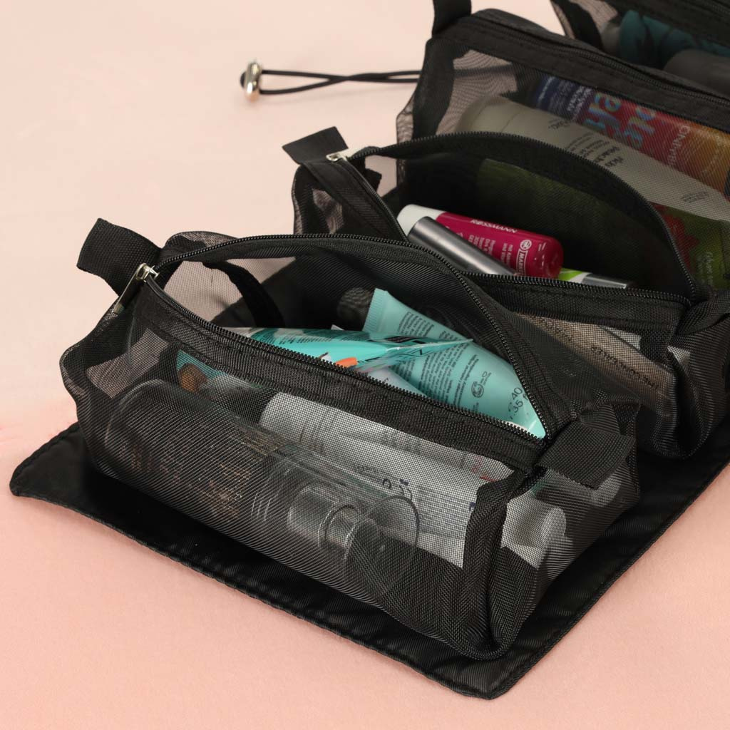 Schwarze Reise-Kosmetiktasche - kann aufgerollt werden, um weniger Platz in Ihrem Gepäck zu beanspruchen. Er hat vier Fächer, die herausgenommen werden können. Die Wände des Fachs sind aus Mesh gefertigt, was das Auffinden der Produkte erleichtert und eine gute Belüftung der nassen Verpackungen gewährleistet.