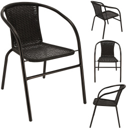 Poszycie krzesła wykonane z technorattanu - idealnie sprawdzającego się w ogrodach - odpornego na warunki atmosferyczne. Ich wykonanie z pewnością pozwoli na wieloletnie użytkowanie a ich konstrukcja spawana, nierozkręcana, malowana jest proszkowo.