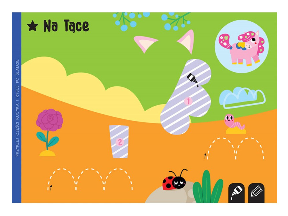 - W książeczce znajduje się 10 koników do wycięcia oraz 10 kart do wyklejenia, co zapewnia estetyczne i rozpoznawalne obrazki, które dostarczają dziecku mnóstwo radości i satysfakcji z samodzielnej pracy.