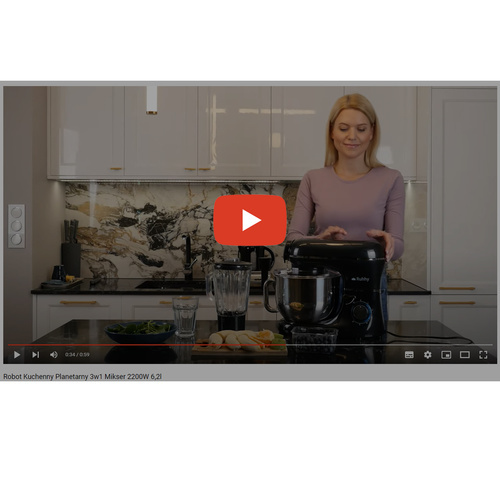 SPECIFIKATION - Schwarze Farbe; Schüsselvolumen: 6,2l; Geschwindigkeitsstufen: 6 Geschwindigkeitsstufen + PULSE; METAL GEAR SYSTEM Antrieb: planetarisch, metallisch; Steuerung: mechanischer Knopf mit roter LED-Beleuchtung; Sicherheitssperre gegen versehentliches Öffnen; Anweisungen: Ja, auf Polnisch; Leistung: 2200 W; Frequenz: 50-60 Hz; Gehäusematerial: ABS-Kunststoffgehäuse; Stromversorgung: 220-240V; Kabellänge: 100 cm; Gerätemaße: 33 x 37 x 24 cm; Verpackungsmaße: 60 x 38 x 28,5 cm; Gerätegewicht: 5,20 kg; Gewicht mit Verpackung: 10,6 kg.