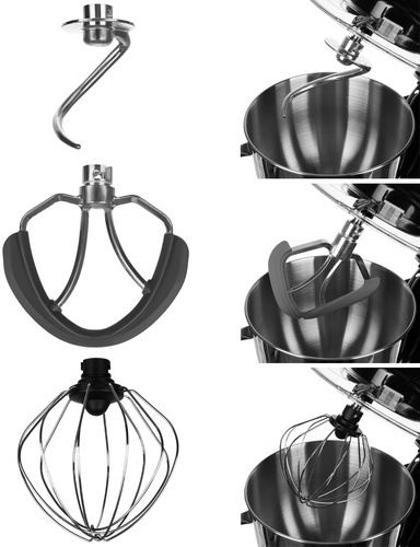3 ARTEN VON AUFSÄTZEN- Das Set enthält 3 Aufsätze zur Zubereitung von Speisen. Zum perfekten Verbinden der Teigzutaten dient ein Rührer mit Silikonrippen. Der Haken wurde zum Kneten von Teig, wie zum Beispiel Hefeteig, entworfen, und der Schneebesen, der zum Schlagen von leichten Zutaten wie Sahne oder Eiweiß verwendet wird.