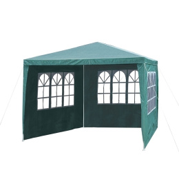 Pawilon ogrodowy z wodoodpornego polietylenu. Prosty w montażu. Odpowiedniej wytrzymałości elementy konstrukcyjne (średnica rurek - 2,5 cm, 1,9 cm) warunkują o stabilności pawilonu. Konstrukcja wykonana ze stali lakierowanej na kolor biały metodą proszkową. Odpowiedni podczas imprez plenerowych i nie tylko. Chroni przed słońcem, a w połączeniu z moskitierą - przed owadami. Skonstruowany z 3 ścian. Każdą ze ścian można osobno przesuwać lub całkowicie zdjąć. Dane techniczne: - wymiary całkowite: długość ok. 3 m, szerokość ok. 3 m, wysokość w najwyższym punkcie 2,5 m - wysokość wejściowa: 2 m - wymiary całkowite okna: szerokość 173 cm, wysokość 96 cm - wymiary pojedynczego okienka: szerokość 56 cm, wysokość 96 cm - materiał: PE 110g/m2 wodoodporny - stelaż: średnica 2,5 cm, 1,9 cm - waga: ok. 8 kg - kolor: zielony W zestawie: - pawilon (dach, 3 ścianki, stelaż, zestaw mocujący = linki + śledzie) - instrukcja montażu PL