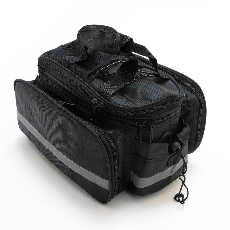 Sakwa wykonana z poliestru o nieprzemakalnym wykończeniu - Waterproof Design. Możliwość zwiększenia objętości głównej komory. Odblaskowe elementy z tyłu i po bokach dla lepszej widoczności i bezpieczeństwa. Gumka kompensacyjna na górnej pokrywie. Wewnętrzne kieszenie na drobiazgi. Pasek na ramię w komplecie. Wysokiej jakości wykończenie wnętrza. Trzy zewnętrzne kieszenie boczne (z możliwością powiększenia). Dane techniczne: doczepiany pasek wbudowany pokrowiec przeciwdeszczowy zewnętrzne kieszenie odblaskowe elementy wymiary: 30x25x25cm Produkt zapakowany w dodatkowy foliopak - gotowy do wysyłki. Ilość szt. na palecie: 360