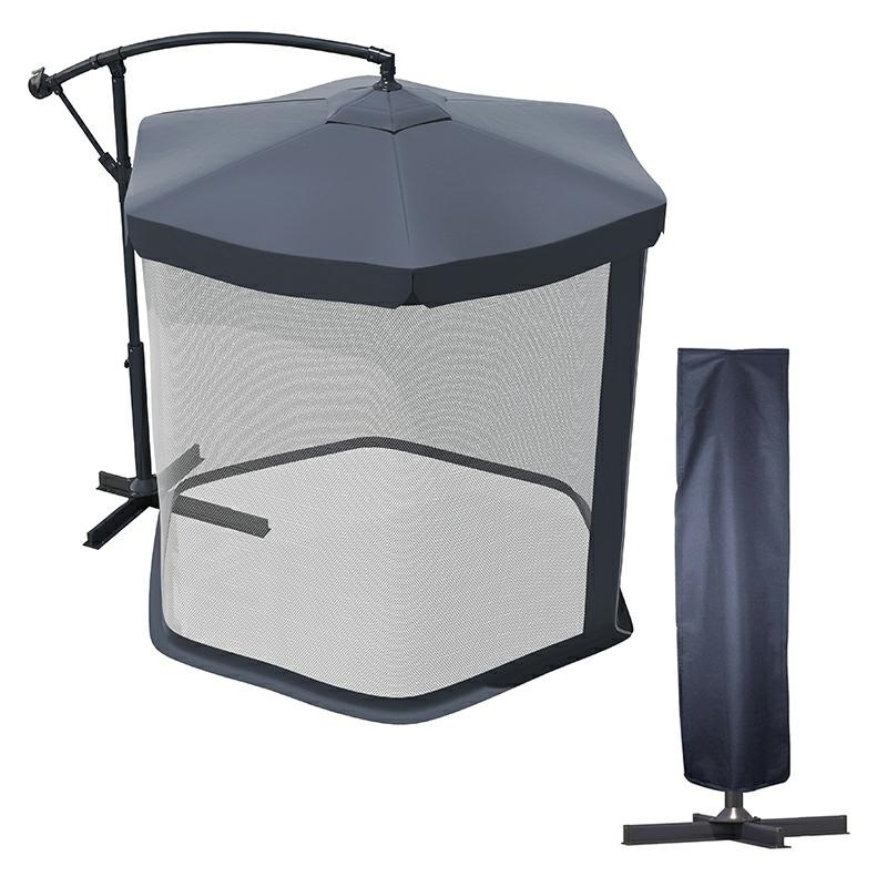 Parasol na wysięgniku wykonany z odpornego na warunki atmosferyczne poliestru. Materiał jakości premium doskonale chroni przed działaniem promieni słonecznych. Wyposażony w mechanizm korbowy. Do zestawu dołączono moskitierę montowaną do parasola na rzepy. Stanowi skuteczną ochronę przed insektami. Parasol po złożeniu zajmuje niewiele miejsca. Parasol należy obciążyć lub przykręcić do podłoża, w przciwnym razie istnieje ryzyko uszkodzenia parasola przez działanie wiatru. Gwarancja nie obejmuje uszkodzeń powstałych na skutek działania porywistego wiatru. Marka: Carruzzo Specyfikacja techniczna: - materiał poszycia: 100% poliester 160g/m2 - kolor: szary - wymiary: wys. 250 cm, śr. czaszy 265cm, śr. po materiale: 300cm - ilość ramion: 6 - stelaż ze stali, śr. 48/54mm - regulowany pochył czaszy - asymetryczna podstawa zapobiegająca przewracaniu się parasola - wysokość wejścia: 190cm - pokrowiec w zestawie - wymiary podstawy: 1x1m - wys. po złożeniu: 2,3m Wodoodporność średnia: 10-30min w zależności od natężenia deszczu. W zestawie: - parasol - stojak - moskitiera na cały parasol z zamknięciem na zamek - pokrowiec - instrukcja obsługi PL Wymiary kartonu: 176x15x29cm Ilość szt. na palecie: 18