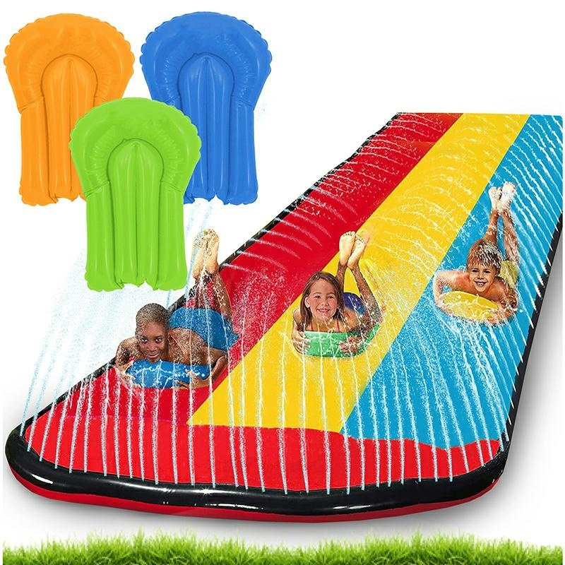 Potrójna ślizgawka / ślizg wodny z fontanną i 3 dmuchanymi deskami. Ślizgawka wodna to niezwykle atrakcyjna forma spędzania czasu na świeżym powietrzu, szczególnie dla najmłodszych. Pozwala na ekscytującą zabawę, zapewniając jednocześnie przyjemne orzeźwienie podczas gorących dni. Gładka powierzchnia zjeżdżalni umożliwia ślizganie się na brzuchu, co nie tylko dostarcza doskonałej rozrywki, ale także skutecznie chłodzi organizm w upalne dni. Tryskająca z boków woda pozwala na swobodny daleki poślizg po wytrzymałej macie. Do rozpoczęcia zabawy wystarczy nadmuchać deski, brzegi ślizgawki oraz podłączyć wąż z wodą. Specyfikacja: długość ślizgu: ok 480cm szerokość ślizgu: 205cm szerokość pojedynczego toru 64cm potrójny tor pozwalający na organizowanie wyścigów W zestawie: 3 dmuchane "deski" do ślizgania się 2 kotwy do przymocowania ślizgu do podłoża Zabawka przeznaczona dla dzieci powyżej 5 roku życia. Produkt zapakowany w dodatkowy foliopak - gotowy do wysyłki. Ilość szt. na palecie: 300