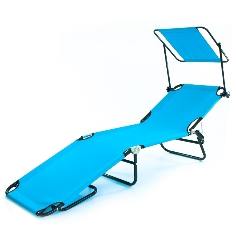 Leżak odpowiedni do ogrodu, na taras, balkon, plażę. Wyposażony w regulowany daszek, zabezpieczający przed promieniami słonecznymi. Regulacja wysokości oparcia pozwala dobrać optymalną pozycję wypoczynku. Leżak łatwo się składa, po złożeniu zajmuje niewiele miejsca, co ułatwia przechowywanie. Siedzisko wykonane z materiału Textilene, który nie nasiąka wodą, jest trwały i łatwo się czyści. Wymiary: - dł. 150 cm - szer. 55 cm - wys.leżyska 30 cm