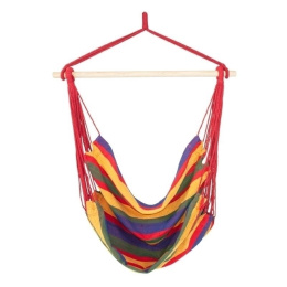 Hamak - krzesło brazylijskie. Relaks i komfort wypoczynku zapewnia forma krzesła, dopasowujacego się do kształtu ciała. Do użytkowania w pomieszczeniu, na tarasie czy w ogrodzie. Wykonany z wytrzymałego materiału. Mocowanie w jednym miejscu na wytrzymałych sznurkach - optymalne rozwiązanie w przypadku braku miejsca do zawieszenia klasycznego hamaka. Marka: Carruzzo Specyfikacja techniczna: - wymiary siedziska: 95x 130 cm - długość drewnianej poprzeczki 90 cm - udźwig do 120 kg - mocowanie plecione ze sznurków - gramatura płótna 220 g/m2 - mocowany na wytrzymałych sznurkach