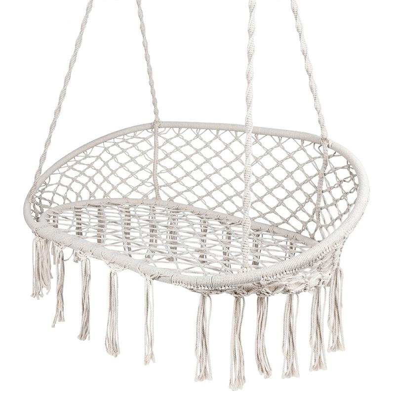 Huśtawka dwuosobowa idealna do ogrodu na taras lub balkon. Posiada 2 punkty zawieszenia z metalowymi kółkami. Huśtawka wykonana została z mocnego sznura oraz metalowych obręczy. Solidne mocowania zapewniają bezpieczeństwo. Marka: Carruzzo Specyfikacja: materiał: poli bawełna + ocynkowana stal szerokość siedziska: 110cm głębokość siedzicka: 70cm szerokość oparcia: 128cm całkowita wysokość: ok. 115cm maksymalne obciążenie: do 240 kg wysokość oparcia: 40cm długość frędzli: 20cm wymiary opakowania: 132x81x5cm Ilość szt. na palecie: 35