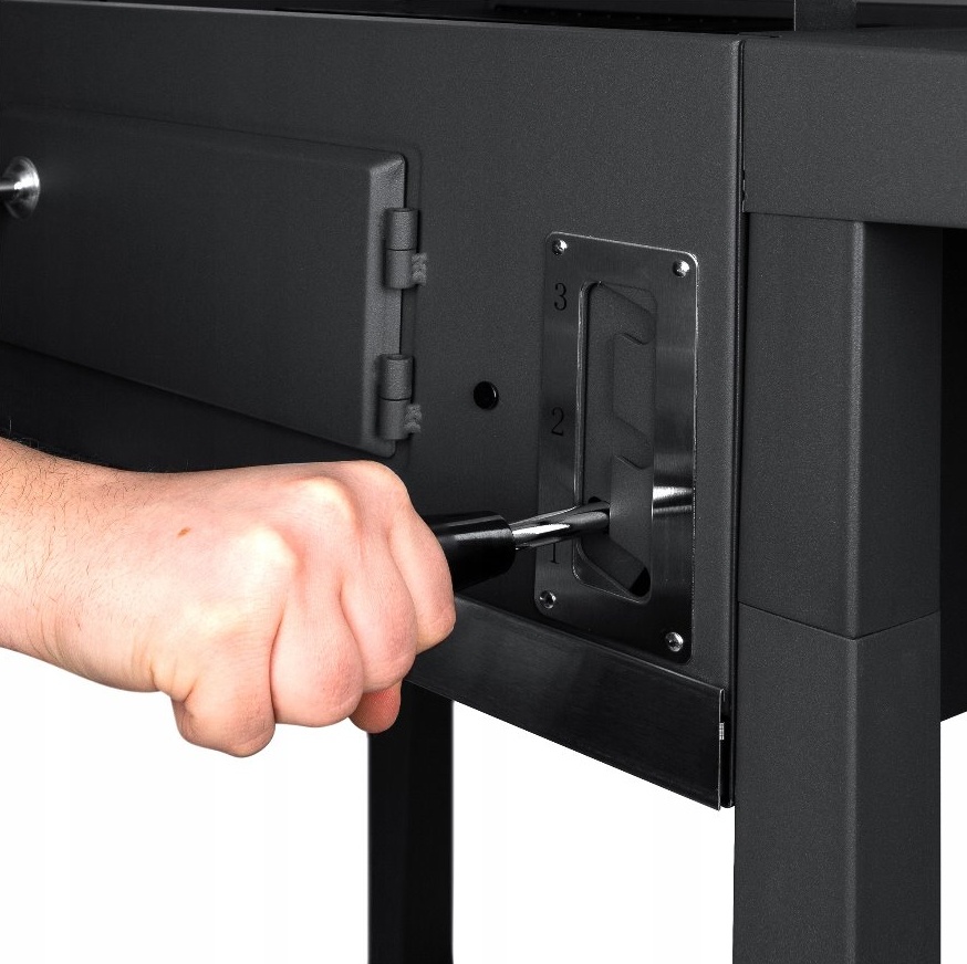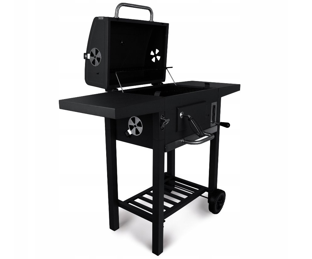 Spezielle Belüftungsöffnungen sorgen für eine gleichmäßige Luftzirkulation beim Grillen und verhindern, dass das Feuer ausbrennt. Die Höhe des Gitters lässt sich einfach mit der Kurbel einstellen.