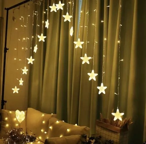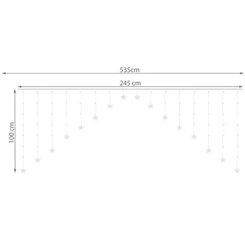 sPEZIFIKATIONEN -Anzahl der Modi: 8; Art der Beleuchtung; GUIDED; Lichtfarbe: warmweiß; LED-Farbe: transparent; Anzahl der LEDs: 136; Wasserdichtigkeitsklasse: IP44; Fernbedienung: ja; Stromversorgung: Netz; Leistung: 1,2 W; Abmessungen eines Sterns: 9 cm; Gesamtlänge: 535 cm; Länge des Eiszapfens: 100 cm; Gewicht: 0,388 kg; Gewicht in der Verpackung: 0,494 kg.