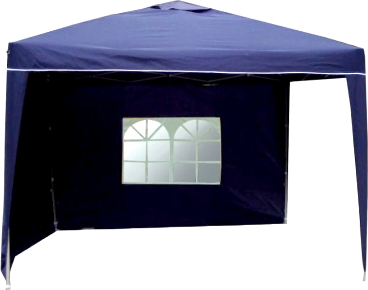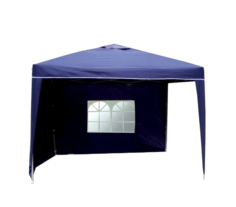Gartenpavillon mit einer schnell zusammenklappbaren Scherenstruktur und zwei wasserdichten Seitenwänden mit einem Fenster.