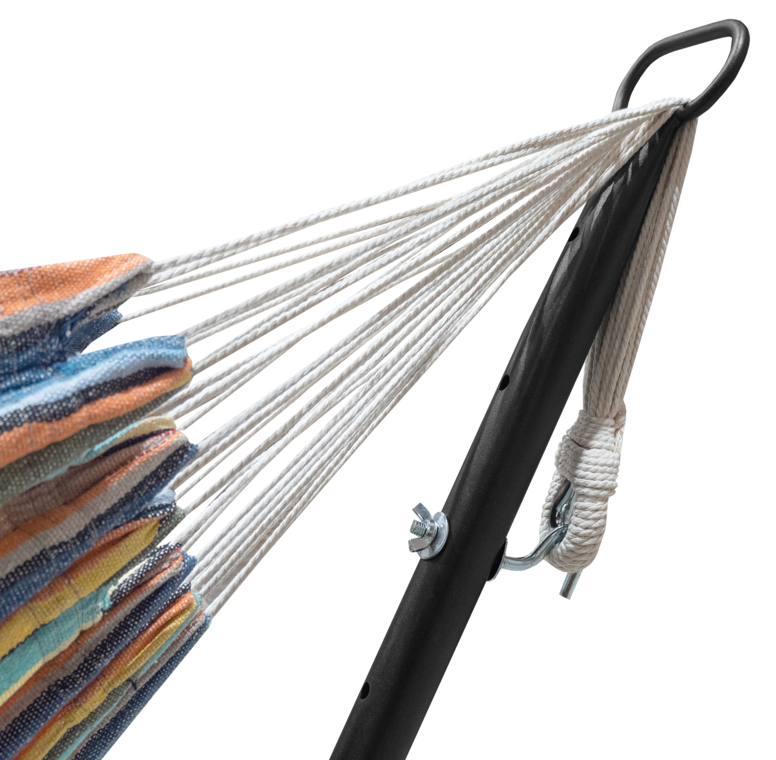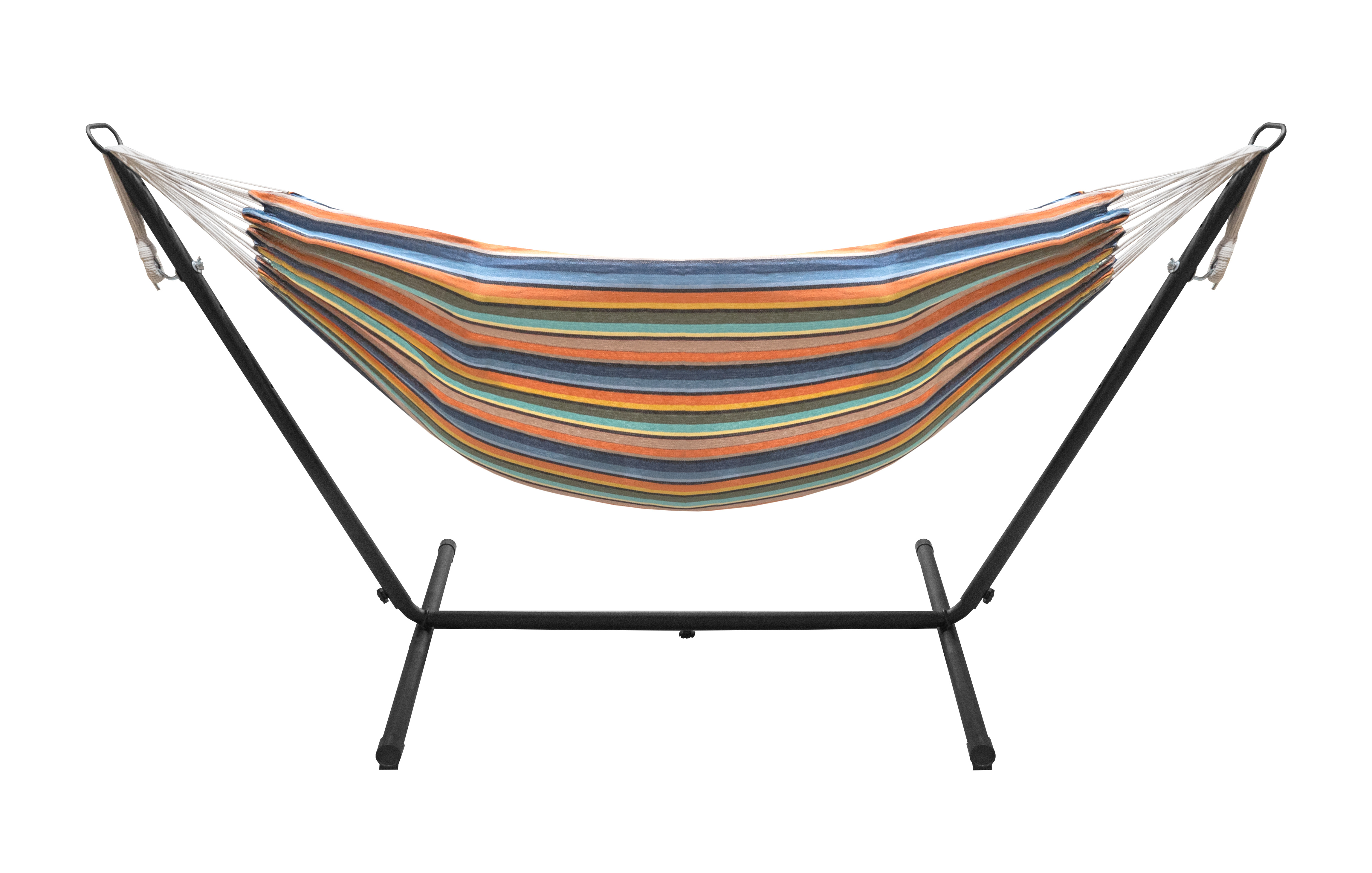 Sie müssen nicht mehr auf die Umgebungsbedingungen Rücksicht nehmen und einen geeigneten Platz für Ihre Hängematte suchen - sie wird mit einem Metallgestell geliefert und kann praktisch überall im Handumdrehen aufgestellt werden.