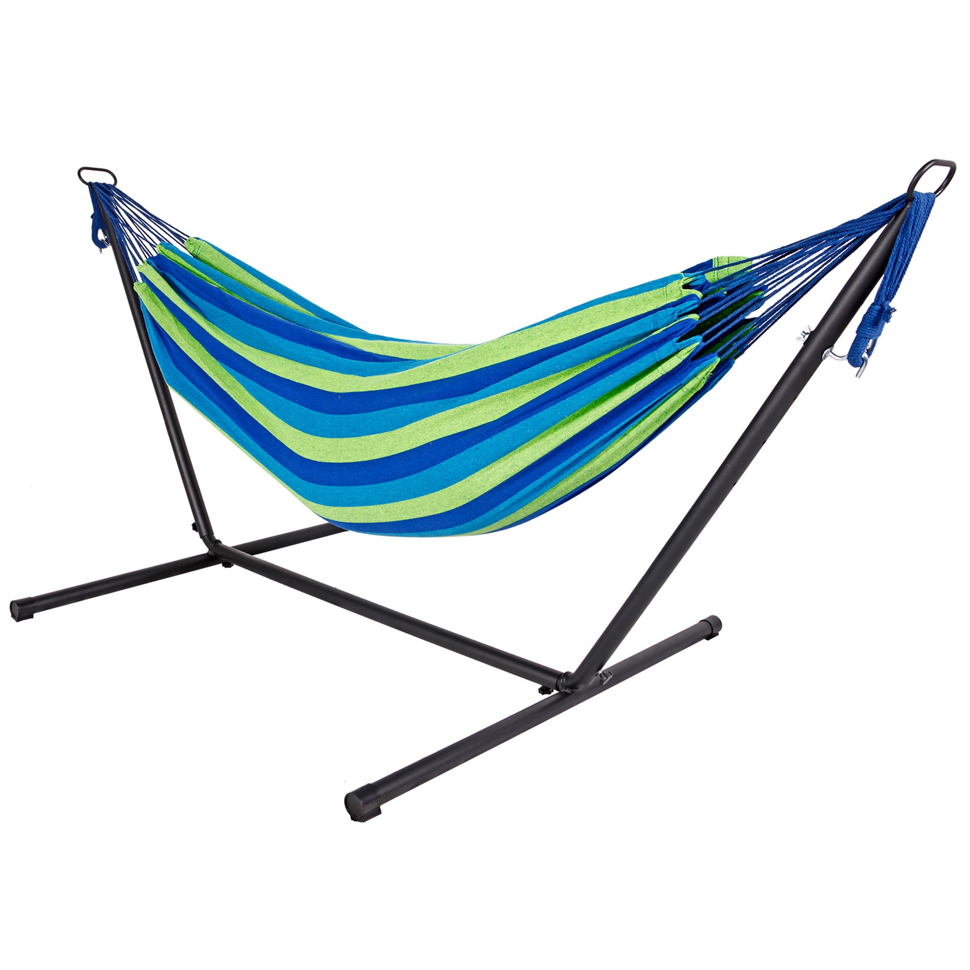 Sie müssen nicht mehr auf die Umgebungsbedingungen Rücksicht nehmen und einen geeigneten Platz für Ihre Hängematte suchen - sie wird mit einem Metallgestell geliefert und kann praktisch überall im Handumdrehen aufgestellt werden.