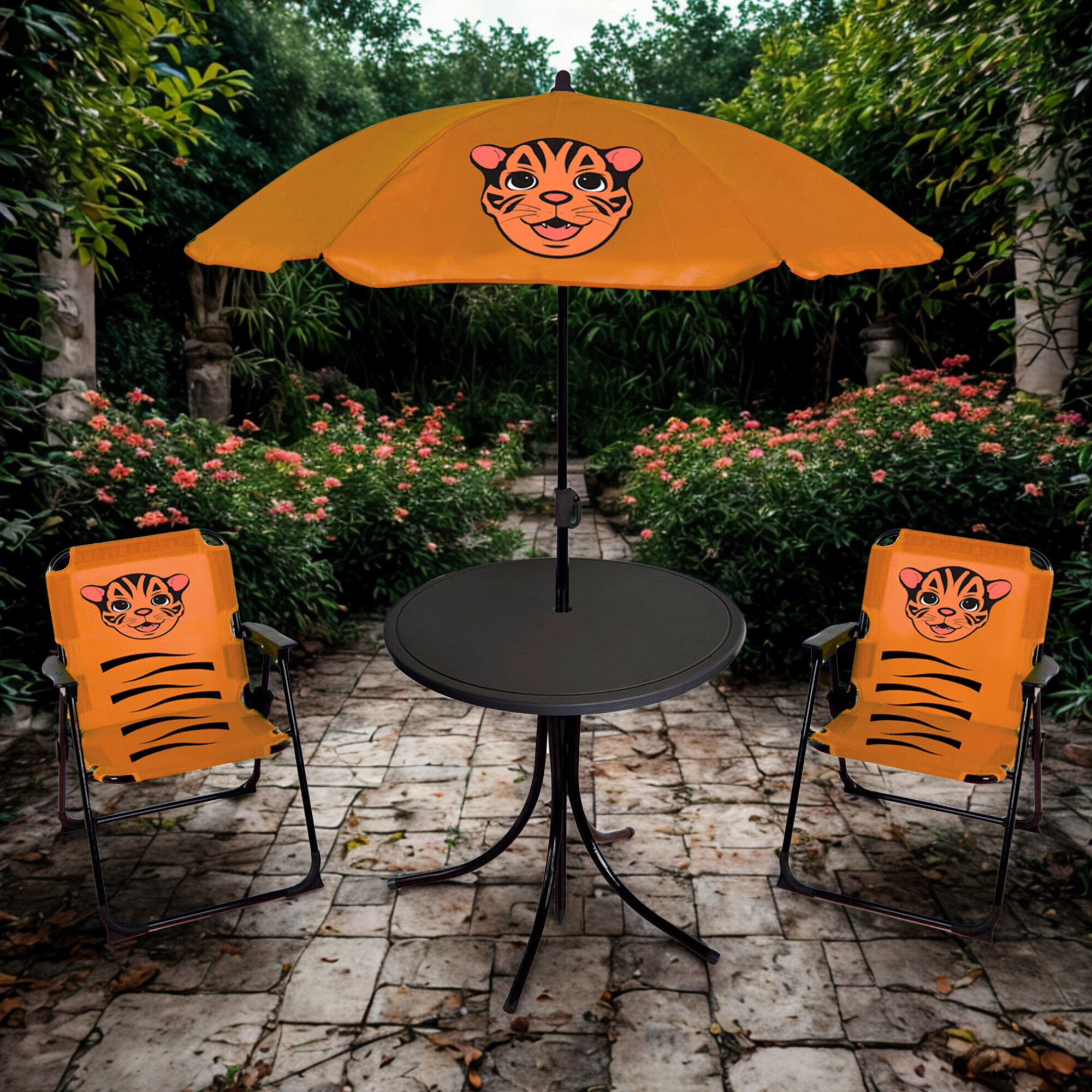 Mit Tiermotiven verzierte Möbel werden die Kinder die ganze Sommersaison über nutzen und so viel Zeit an der frischen Luft verbringen. Sie setzen sich bequem auf die bunten Sitze und genießen eine angenehme Mahlzeit am runden Tisch. Außerdem werden sie dank des Sonnenschirms im Schatten sein, wo sie in Ruhe spielen, lesen oder ihre Besucher empfangen können.