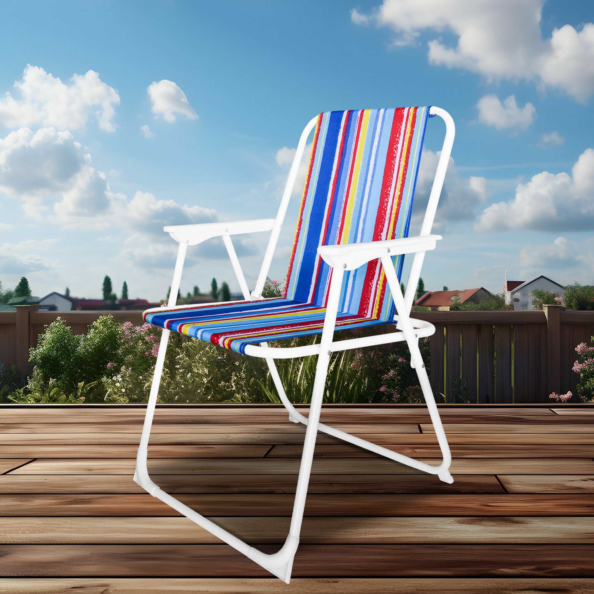 Klappbarer Gartenstuhl mit bequemen Armlehnen, ideal für Camping, aber auch für Angler, Modellbauer, Hüttenwirte und Landwirte.