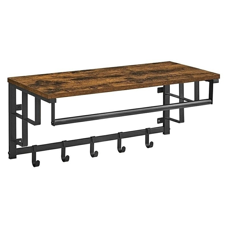 Praktyczna i stylowa półka w stylu rustykalnym z wieszakami na ubrania. Idealna do zamontowania w korytarzu - umożliwia powieszenie 5 okryć wierzchnich dzięki metalowym haczykom, dodatkowy pałak pozwala na użycie tradycyjnych wieszaków na ubrania. Specyfikacja: blat wykonany z płyty meblowej, stelaż oraz haki wykonane są ze stali półka do przechowywania kapeluszy, parasoli itp. 5 ruchomych haków wymiary: szer.:66cm, gł.:30cm, wys.:28cm (z wieszakami 32cm) wymiary opakowania: 69x9,5x34,5cm Ilość szt. na palecie: 60