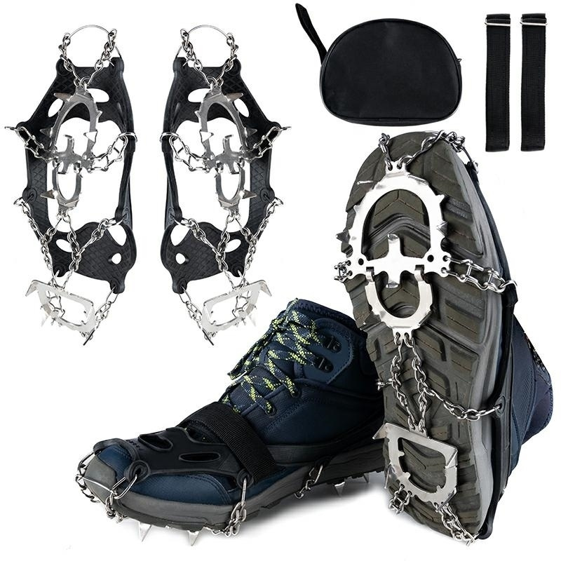 Uniwersalne raczki antypoślizgowe na buty zapewnią przyczepność w każdych warunkach. Świetnie sprawdzą się na oblodzonych i zaśnieżonych nawierzchniach. Specyfikacja: Rozmiar: L Pasuje do obuwia o rozmiarze 42-45 Materiał: stal nierdzewna + silikon Grubość łańcucha: 2mm Ilość zębów: 12 Wysokość zębów: 9-17mm Długość: 22cm Szerokość: 17cm