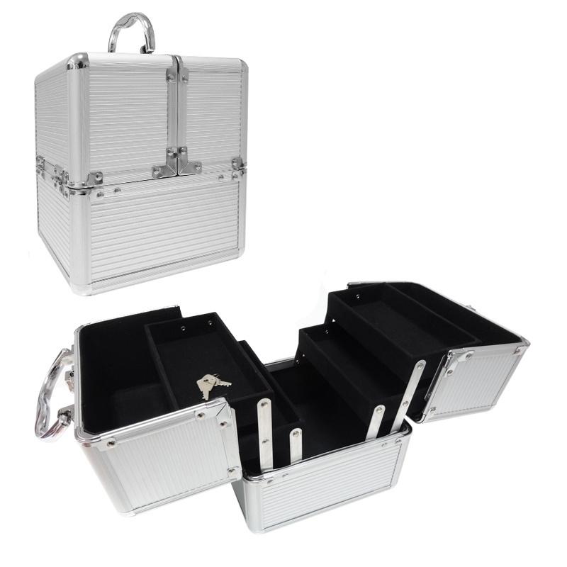 Organizer, aluminiowy kuferek na kosmetyki lub biżuterię. Gruby stelaż sprawia, że konstrukcja jest bardzo stabilna. Kuferek jest zabezpieczony przed otwarciem za pomocą zamka (2 kluczyki w zestawie). Cztery wysuwane półki oraz dolny pojemnik zapewniają wiele miejsca na kosmetyki, akcesoria oraz biżuterię. Wnętrze wyścielone jest czarnym, matowym materiałem. WWymiary: 20cm x 18cm x 18cm waga: 950g