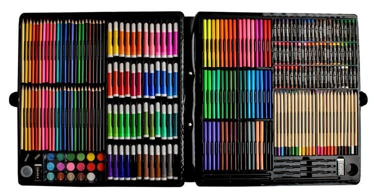 288 ARTIKEL - Mit Hilfe der riesigen Auswahl von 72 Buntstiften, 96 Filzstiften, 60 Ölkreiden, 18 Aquarellfarben, 3 Bleistiften, 3 Pinseln mit Wasserbehälter, 30 Büroklammern, Anspitzern und 2 Radiergummis können wir leicht die anspruchsvollsten, kreativsten und originellsten Werke schaffen.
