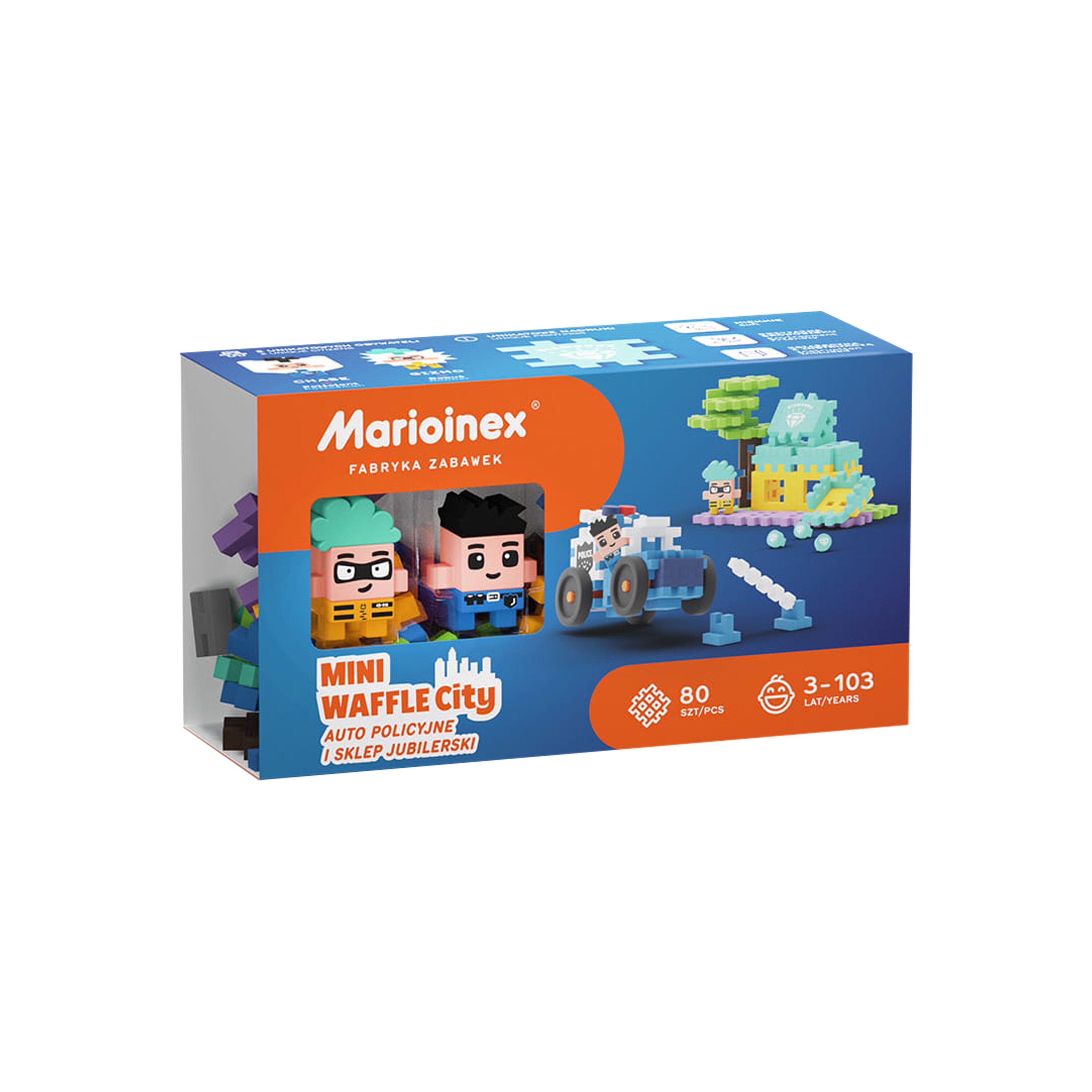 Das Bauset besteht aus 80 Teilen und zwei einzigartigen Figuren. Versetzen Sie sich in die Rolle eines heldenhaften Polizisten und fangen Sie den rücksichtslosen Räuber, oder wählen Sie die Seite von Gizmo und versuchen Sie, der wilden Verfolgungsjagd zu entkommen.