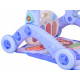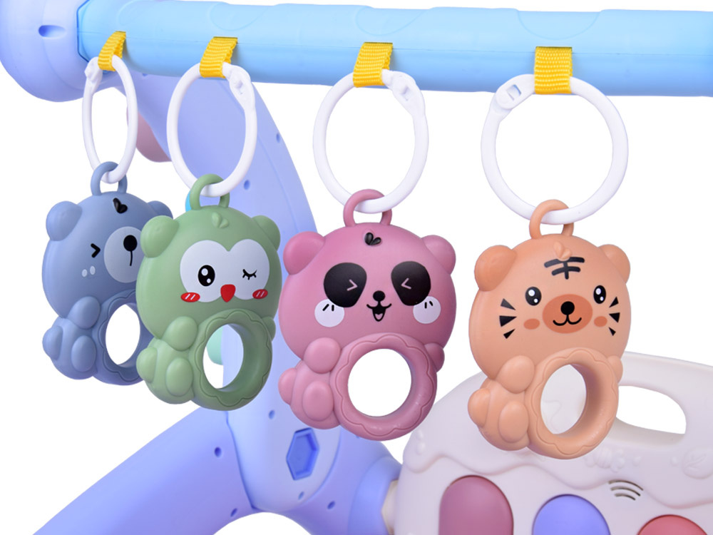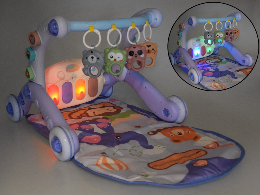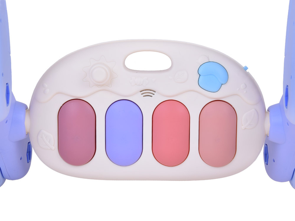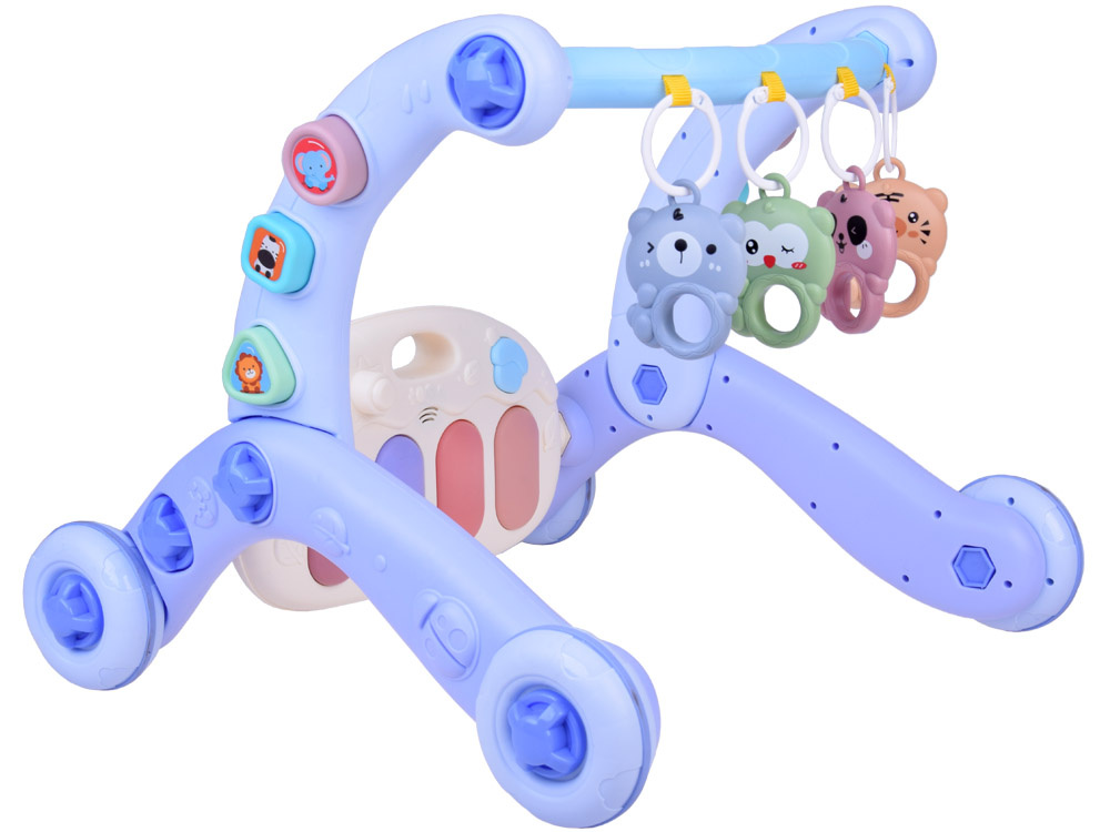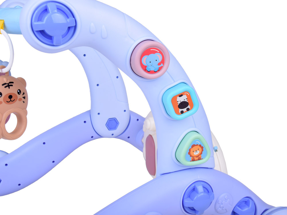 Zabawa i rozwój sensoryczny: Interaktywne pianinko z kolorowymi, różnymi melodyjkami, dźwiękami, odgłosami śmiechu dziecka, rozwija słuch i kreatywność, a kolorowe zawieszki w kształcie zwierzątek zachęcają do chwytania, wzmacniając umiejętności manualne. Pałąk pchacza wyposażony jest także w sorter, który stymuluje dziecko do zabawy w dopasowywanie kształtów za pomocą pastelowych klocków.