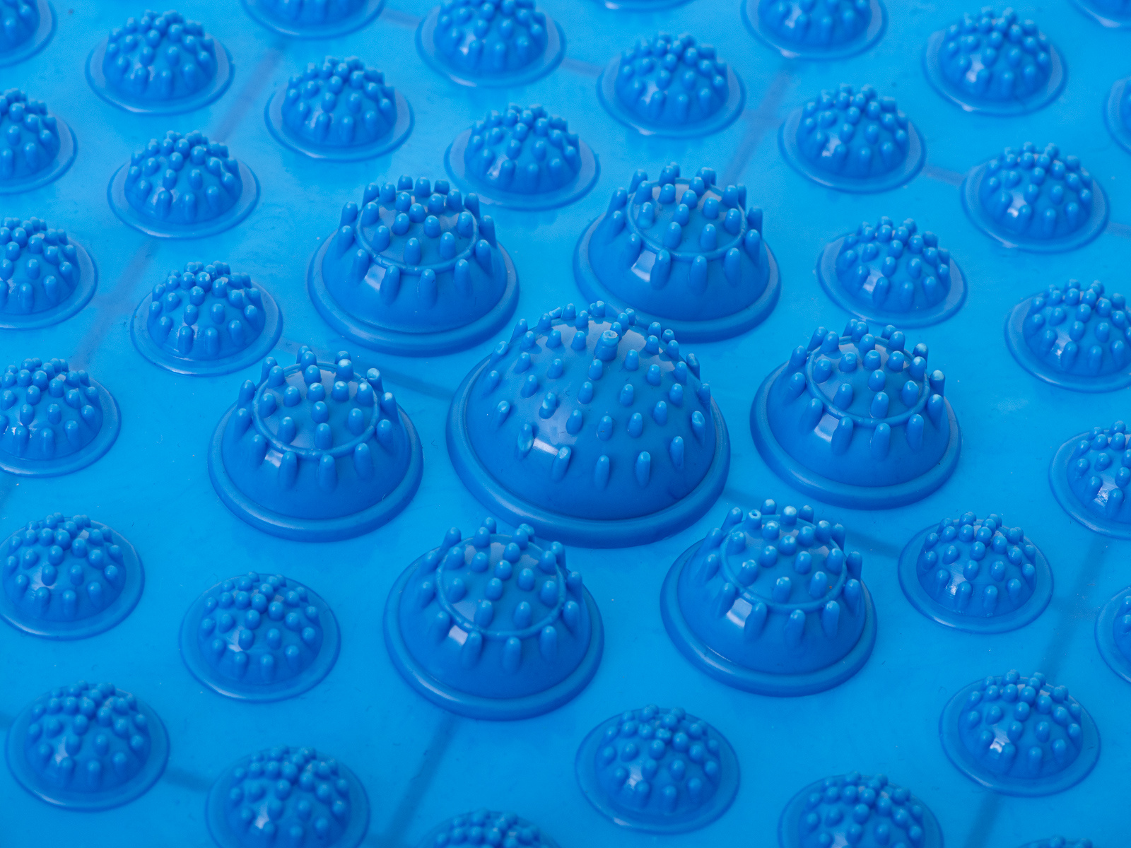 Auf der farbenfrohen Matte befinden sich viele Unebenheiten, die die Blutzirkulation in den Füßen anregen sollen.