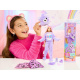 W zestawie znajduje się aż 10 niespodzianek: oprócz lalki i kostiumu znajdziesz spódniczkę, opaskę do włosów, okulary przeciwsłoneczne, buciki, grzebień z gąbeczką oraz miniaturowego fioletowego misia.