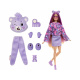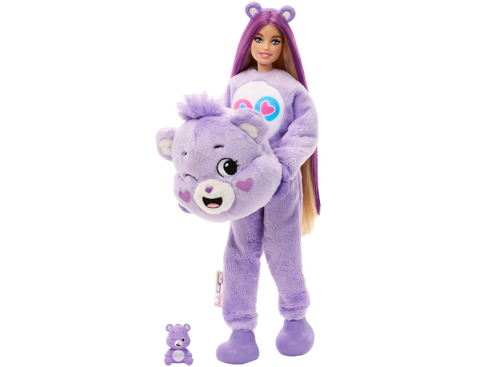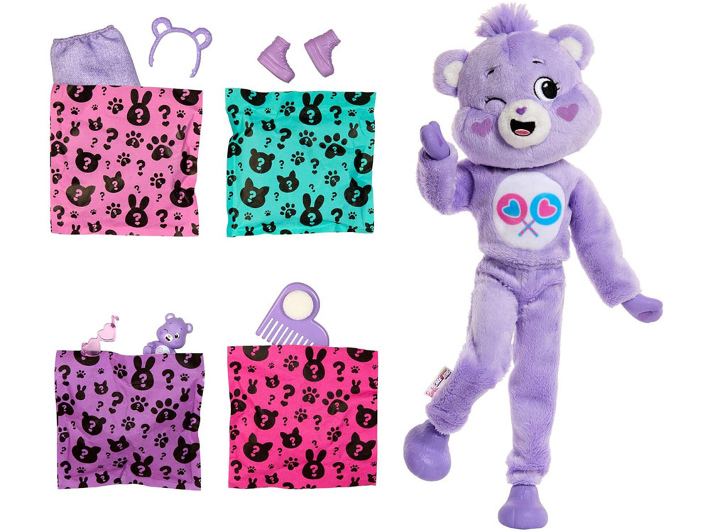 Lalka Barbie ukryta jest w miękkim, pluszowym kostiumie misia. Po jego zdjęciu odkrywamy stylową lalkę o delikatnych rysach twarzy i długich włosach, gotową do zabawy w stylizację i opowiadanie historii.