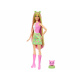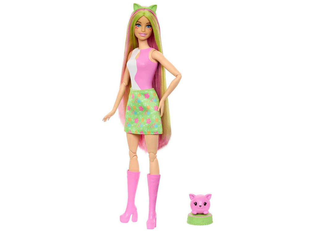 Wewnątrz znajduje się Barbie® o intensywnie różowo-zielonych włosach, o subtelnym zapachu owocowego shake’a, uśmiechnięta i gotowa na zabawę. Towarzyszy jej mięciutki kotek, który nie tylko wygląda uroczo, ale też pięknie pachnie. Do kompletu dołączone są: wygodne legowisko dla pupila oraz opaska z kocimi uszkami, idealnie pasująca do stylizacji Barbie®.