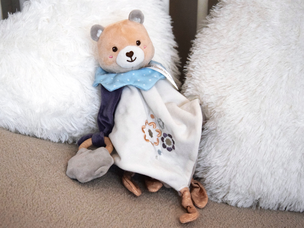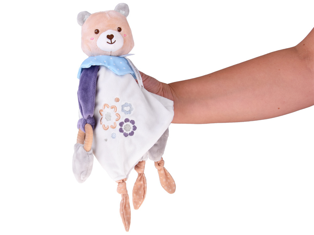 Uroczy pluszowy miś z materiałowym kocykiem, gryzakiem, supełkami, szeleszczącą gwiazdką, metką to idealny towarzysz maluszka już od pierwszych dni życia
