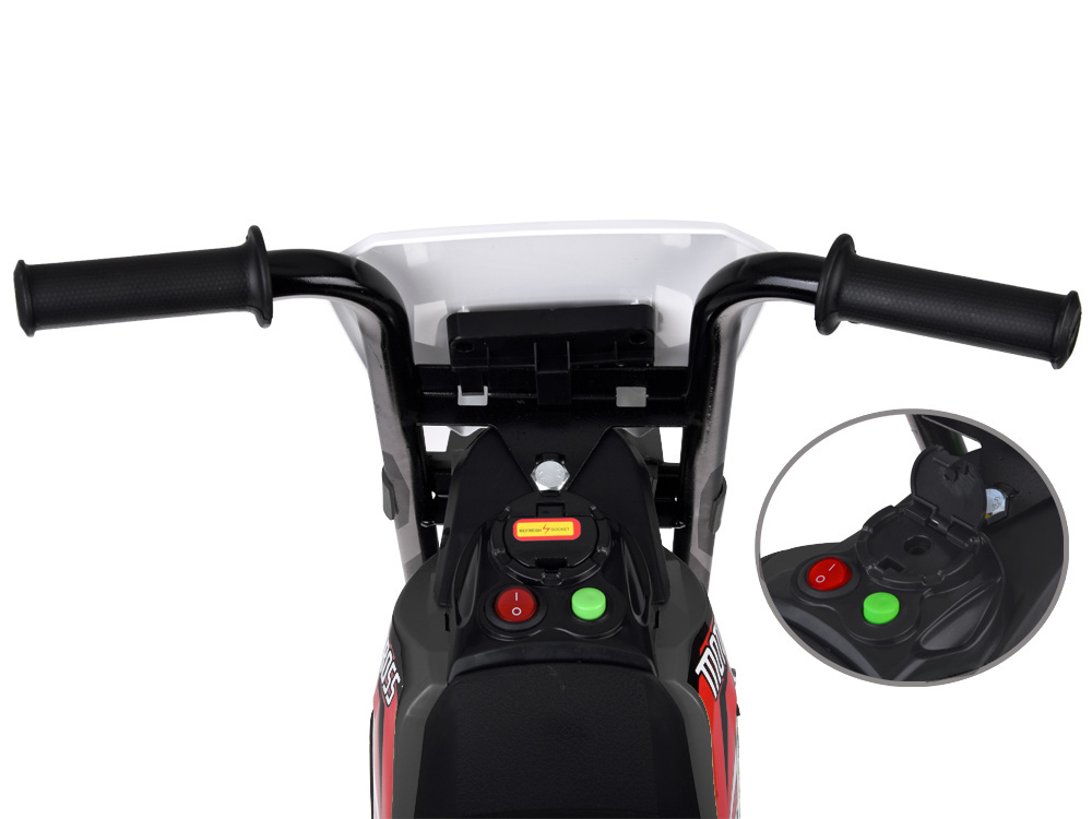 Motorek odpalany jest za pomocą przycisku. Tuż obok znajdziemy przycisk odpowiadający za uruchomienie melodii- do wyboru mamy kilka energicznych piosenek, które sprawią, że jazda będzie przyjemniejsza (piosenki w języku angielskim).