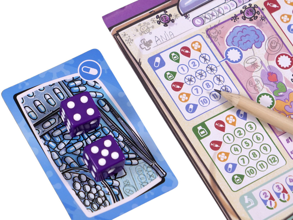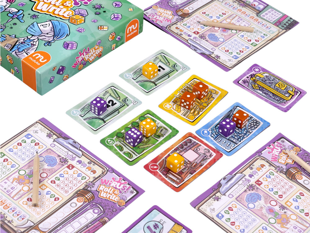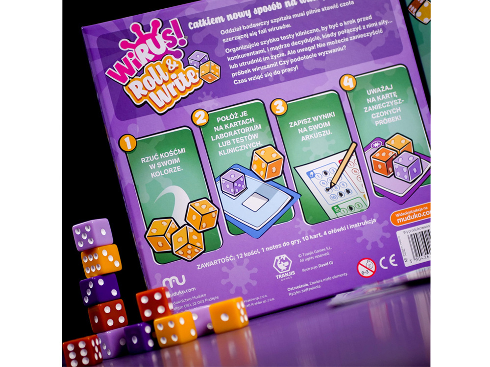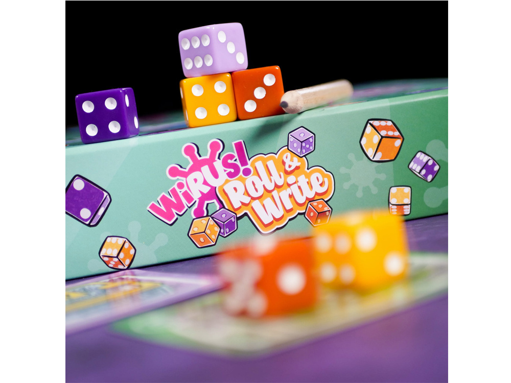 To zupełnie nowa odsłona popularnej serii gier „Wirus!”, tym razem w wersji kościanej. Zamiast kart gracze korzystają z kości i notesu, ale mimo zmiany formy rozgrywka wciąż pozostaje dynamiczna, prosta i pełna interakcji.