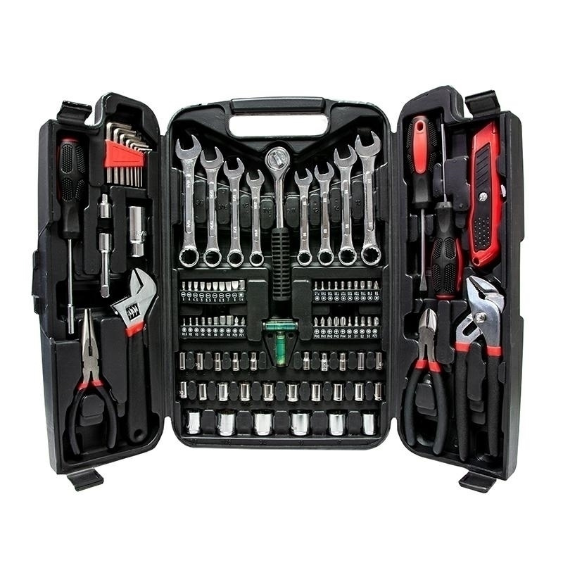 Zawartość zestawu 1 x nóż 1 x szczypce nastawne do pomp wodnych 8" (francuz) 2 x śrubokręt (płaski i krzyżakowy) 1 x szczypce do przecinania 6" 8 x klucz płasko-oczkowy (11mm, 12mm, 14mm, 15mm, 5/8", 9/16", 1/2", 7/16") 1 x grzechotka 1 x poziomica 40 x bit (płaskie: 3, 4, 4.5, 5, 5.5, 6, 6.5, 7, 8mm, 6kątny 1/4", H1.5, H2, H3, H4, H5, H6, H7, H8, PZ0, PZ1, PZ2, PZ3, T8, T10, T15, T20, T25, T27, T30, T35, T40, PH0, PH1, PH2, PH3, PH4, S0, S1, S2, S3) 8 x klucz imbusowy (6, 5.5, 5, 4, 3, 2.5, 2, 1.5mm) 1 x klucz do świecy zapłonowej 21mm 1 x adapter 1 x przedłużka 1 x końcówka do bitów 1 x szczypce półokrągłe 1 x klucz nastawny 8" 20 x 1/4" nasadka (5/16", 9/32", 11/32", 8/8", 7/16", 15/32", 1/2", 5/8", 11/16", 3/4", 7mm, 8mm, 9mm, 10mm, 11mm, 12mm, 13mm, 14mm, 17mm, 19mm) 6 x 3/8" nasadka (1/4", 3/16", 5/32", 4mm, 5mm, 6mm)Ilość szt. w kartonie: 4 Ilość szt. na palecie: 120