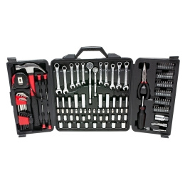 Zawartość zestawu: 10 x klucz płasko-oczkowy (8,10,11,12,13mm, 5/16, 3/8, 7/16, 1/2, 9/16") 1 x taśma miernicza 5 m 1 x młotek ciesielski 24 x klucz imbusowy (1/4"-0.03", 6mm-0.9mm) 4 x śrubokręt precyzyjny (2 krzyżakowe i 2 płaskie) 1 x szczypce 2 x klucz grzechotkowy 1x wkrętak z końcówką do bitów 10 x 3/8" nasadka DR 36 x 1/4" nasadka DR 1 x końcówka do bitów 48 x bit (płaskie: 3, 4, 4.5, 5.5, 6, 6.5, 7mm, H1.5, H2, H3, H4, H5, H6, H7, H8, S0, S1x2, S2x2, S3x2, AD, PH0, PH1x2, PH2x2, PH3x2, PH4, T8, T10, T15, T20, T25, T27, T30, T40, PZ0, PZ1x2, PZ2x2, PZ3x3, PZ4) 1 x klucz do świecy zapłonowej 21mm 1 x 3/8" przedłużka 1 x 3/8" adapter 1 x adapter do bitów 60mm Ilość szt. w kartonie: 4 Ilość szt. na palecie: 120
