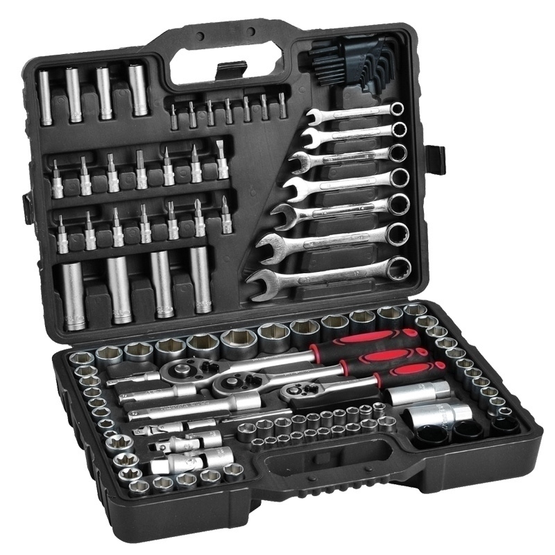 Markowy zestaw narzędzi-kluczy w walizce - 120szt . 6 x 1/2” nasadka DR: 19, 20, 21, 22, 24, 27 mm 11 x 3/8” nasadka DR: 8-9-10-11-12-13-14-15-16-17-18 mm 8 x 3/8” nasadka DR typu E: E8-E10-E11-E12-E14-E16-E18-E20 4 x 1/2” nasadka DR: 3/4, 13/16, 7/8, 15/16” 3 x 1/2 klucze nasadowe: 17-19-21 mm 7 x 25 mm (L) bit: (T) 10-15-20-25-27-30-40 4 x 3/8” nasadka DR 13-14-15-17 mm 8 x 3/8 nasadka DR 5/16-3/8-7/16-15/32-1/2-9/16-5/8-11/16 1 x 1/4” nasadka DR bit: (T) 10, 15, 20, 25, 30 (H) 3-4-5-8 (*) 1-2 (-) 4, 5, 6, 7 4 x 1/4” nasadka DR: 8-9-10-12 mm 10 x 1/4 nasadka DR: 5/32-3/16-7/32-1/4-9/32-5/16-11/32-3/8-7/16-1/2” 3 x 1/4” nasadka DR & 3/8” DR & 1/2” universeller Anschluss / universal joint / uniwersalne złącze 1 x 1/4” DR x 1/4” łącznik DR 1 x 1/4” adapter końcówek 2 x 3/8” gniazdo 16 mm & 21 mm 7 x klucz nastawny: 8-10-12-13-14-15-17 mm 1 x 1/4” przedłużka: 50 mm 1 x 3/8” przedłużka: 75 mm 1 x 1/2” przedłużka: 125 mm 3 x 1/4” DR & 3/8” DR & 1/2” uchwyt wkrętaka grzechotkowego W/QR 10 x 1/4 nasadka DR: 4-5-6-7-8-9-10-11-12-12 mm 11 x klucz do śrub z 6-kątnym gniazdem 1.27-6 mm