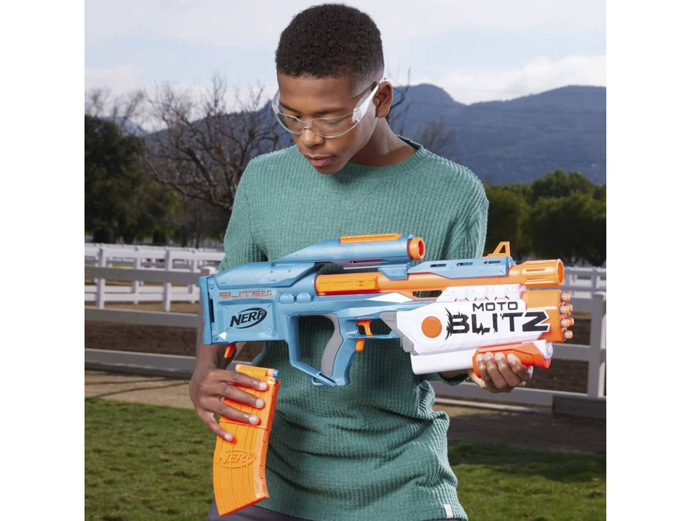 Die robuste Konstruktion des Motoblitz CS-10 Blaster sorgt für einen festen Griff, während das integrierte Visier ein präzises Anvisieren und ein fehlerfreies Treffen des Ziels ermöglicht. Die taktische Stange ermöglicht es Ihnen auch, den Blaster mit Nerf-Zubehör an Ihre eigenen Vorlieben anzupassen.
